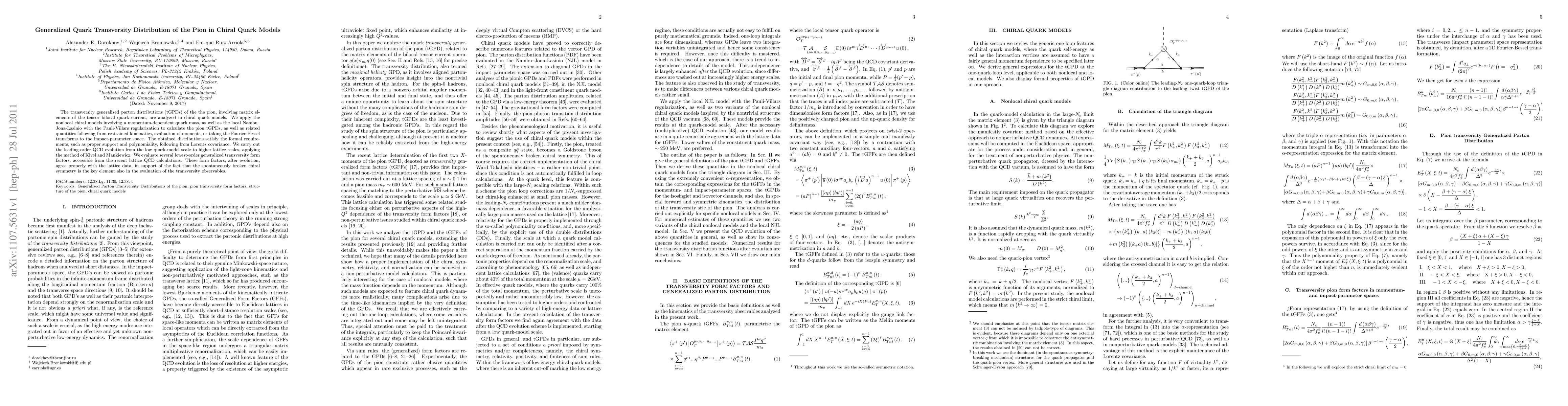 The transversity generalized parton distributions (tGPDs) of the the pion, involving matrix elements of the tensor bilocal quark current, are analyzed in chiral quark models. We apply the nonlocal chiral models involving a momentum-dependent quark mass, as well as the local Nambu--Jona-Lasinio with the Pauli-Villars regularization to calculate the pion tGPDs, as well as related quantities following from restrained kinematics, evaluation of moments, or taking the Fourier-Bessel transforms to the impact-parameter space. The obtained distributions satisfy the formal requirements, such as proper support and polynomiality, following from Lorentz covariance. We carry out the leading-order QCD evolution from the low quark-model scale to higher lattice scales, applying the method of Kivel and Mankiewicz. We evaluate several lowest-order generalized transversity form factors, accessible from the recent lattice QCD calculations. These form factors, after evolution, agree properly with the lattice data, in support of the fact that the spontaneously broken chiral symmetry is the key element also in the evaluation of the transversity observables.