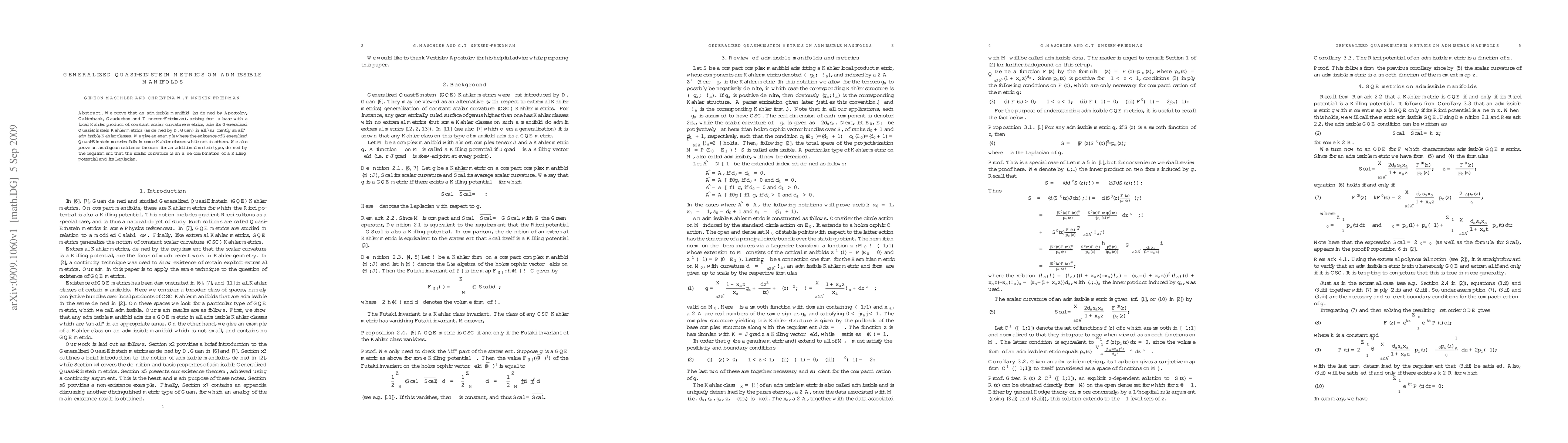 We prove that an admissible manifold (as defined by Apostolov, Calderbank, Gauduchon and T{\o}nnesen-Friedman), arising from a base with a local K\"ahler product of constant scalar curvature metrics, admits Generalized Quasi-Einstein K\"ahler metrics (as defined by D. Guan) in all "sufficiently small" admissible K\"ahler classes. We give an example where the existence of Generalized Quasi-Einstein metrics fails in some K\"ahler classes while not in others. We also prove an analogous existence theorem for an additional metric type, defined by the requirement that the scalar curvature is an affine combination of a Killing potential and its Laplacian.