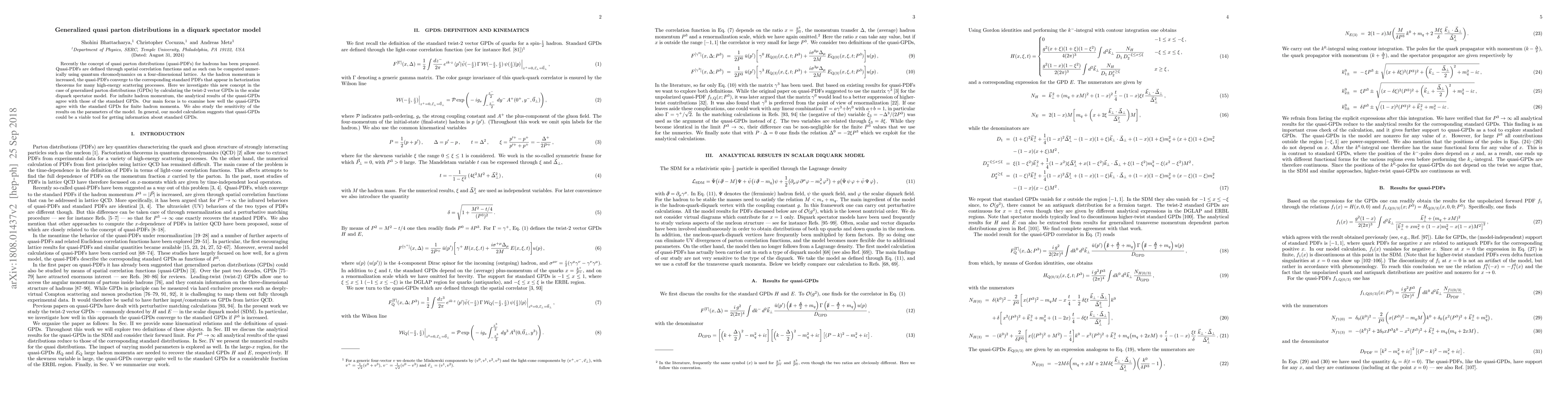 This paper explores the concept of generalized quasi parton distributions (quasi-PDFs) in a diquark spectator model, comparing them to standard generalized parton distributions (GPDs). It finds that quasi-GPDs can provide insights into standard GPDs, especially as hadron momentum increases.