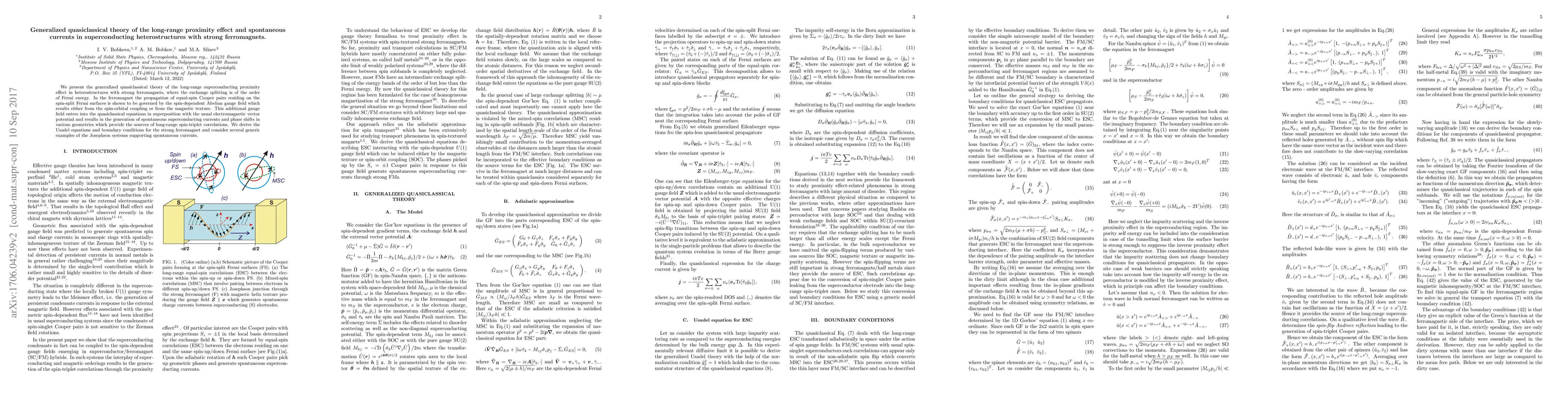 This paper develops a generalized quasiclassical theory to describe the long-range superconducting proximity effect in heterostructures with strong ferromagnets, showing how spin-triplet Cooper pairs generate spontaneous currents and phase shifts due to a spin-dependent Abelian gauge field. The study derives Usadel equations and boundary conditions for these systems and explores examples of Josephson junctions with spontaneous currents.