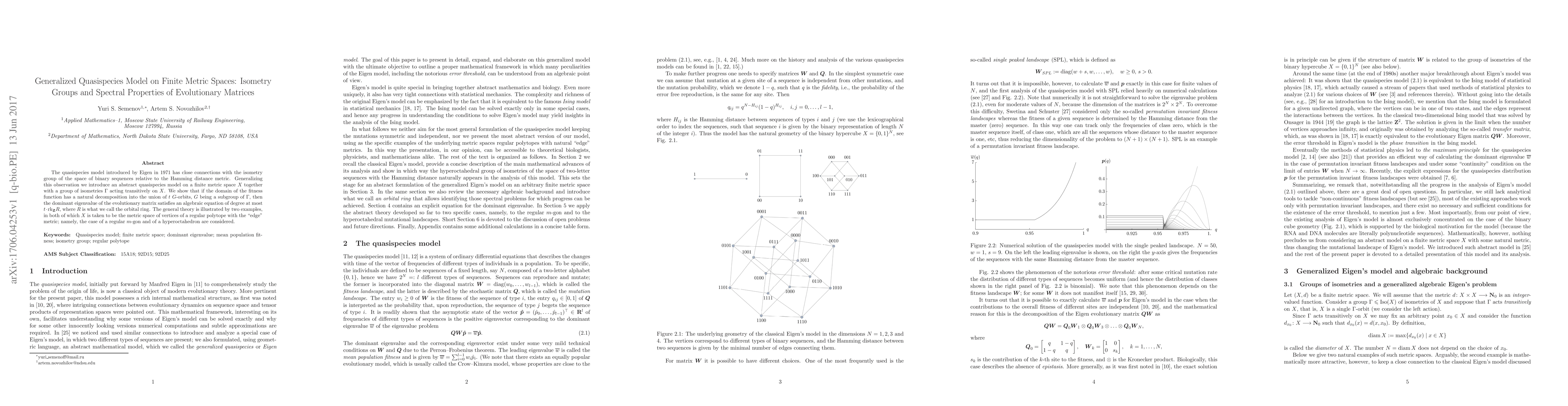 This paper generalizes the quasispecies model to finite metric spaces with isometry groups, showing that the dominant eigenvalue of the evolutionary matrix is constrained by an algebraic equation dependent on the structure of the fitness function's domain and the orbital ring. Examples include regular polygons and hyperoctahedrons.