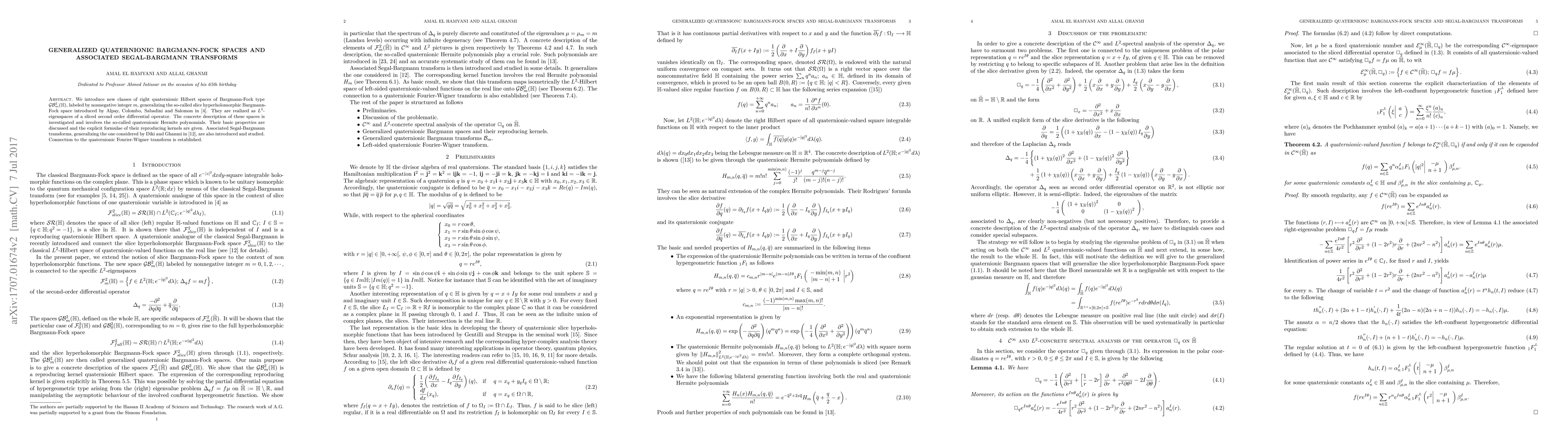 We introduce new classes of right quaternionic Hilbert spaces of Bargmann-Fock type $\mathcal{GB}_{m}^{2}(\mathbb{H})$, labeled by nonnegative integer $m$, generalizing the so-called slice hyperholomorphic Bargmann-Fock space introduced recently by Alpay, Colombo, Sabadini and Salomon (2014). They are realized as $L^2$-eigenspaces of a sliced second order differential operator. The concrete description of these spaces is investigated and involves the so-called quaternionic Hermite polynomials. Their basic properties are discussed and the explicit formulae of their reproducing kernels are given. Associated Segal-Bargmann transforms, generalizing the one considered quite recently by Diki and Ghanmi (2017), are also introduced and studied. Connection to the quaternionic Fourier-Wigner transform is established.