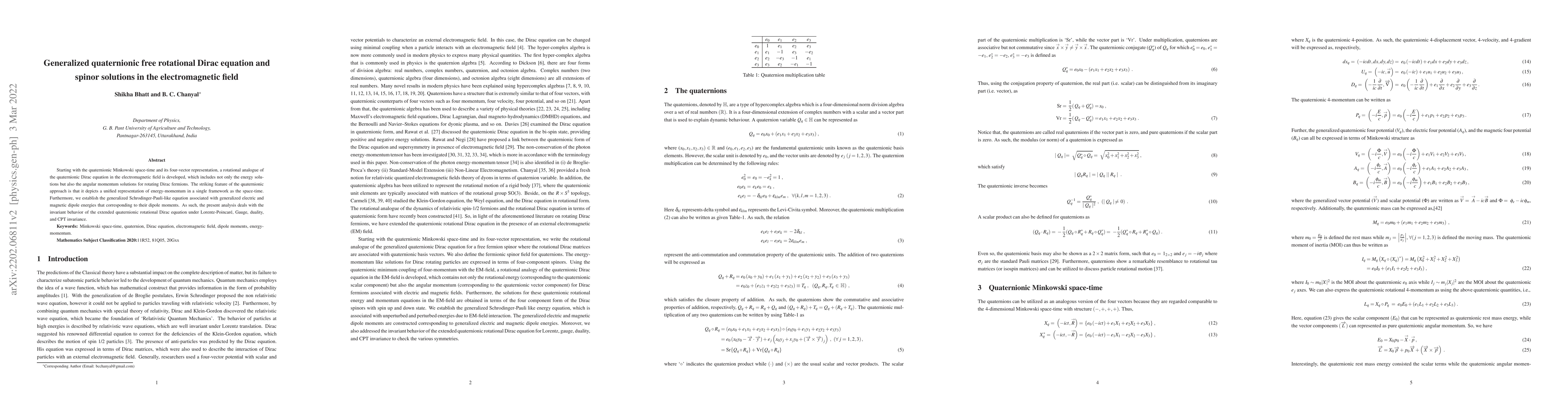 This paper develops a rotational analogue of the quaternionic Dirac equation for Dirac fermions in an electromagnetic field, incorporating both energy and angular momentum solutions. It also establishes a generalized Schrödinger-Pauli-like equation for electric and magnetic dipole energies, demonstrating invariance under Lorentz, gauge, duality, and CPT transformations.