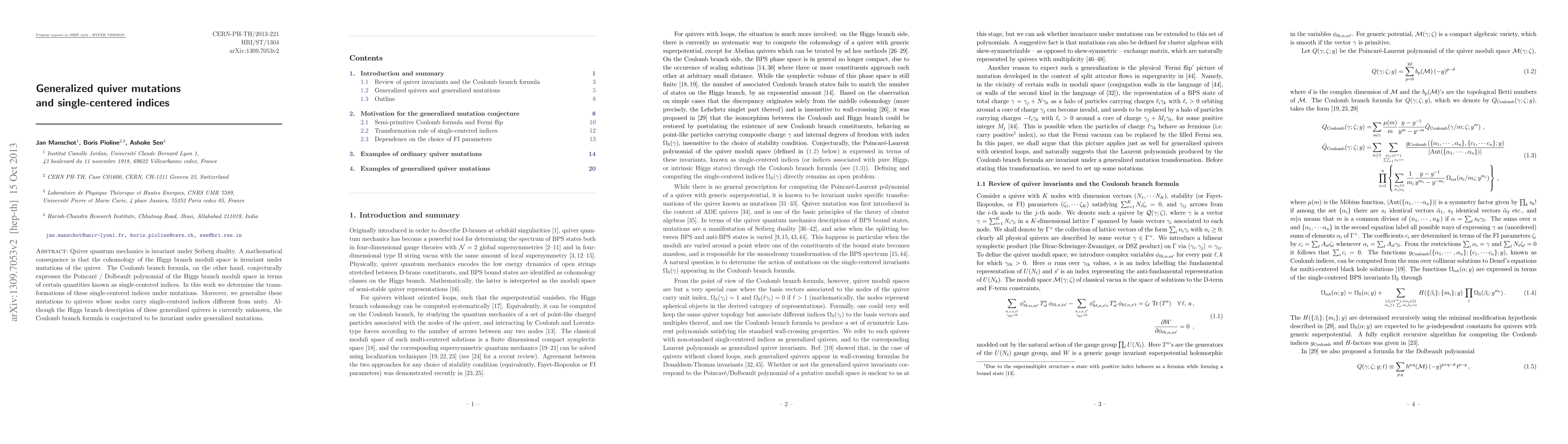 Quiver quantum mechanics is invariant under Seiberg duality. A mathematical consequence is that the cohomology of the Higgs branch moduli space is invariant under mutations of the quiver. The Coulomb branch formula, on the other hand, conjecturally expresses the Poincar\'e / Dolbeault polynomial of the Higgs branch moduli space in terms of certain quantities known as single-centered indices. In this work we determine the transformations of these single-centered indices under mutations. Moreover, we generalize these mutations to quivers whose nodes carry single-centered indices different from unity. Although the Higgs branch description of these generalized quivers is currently unknown, the Coulomb branch formula is conjectured to be invariant under generalized mutations.