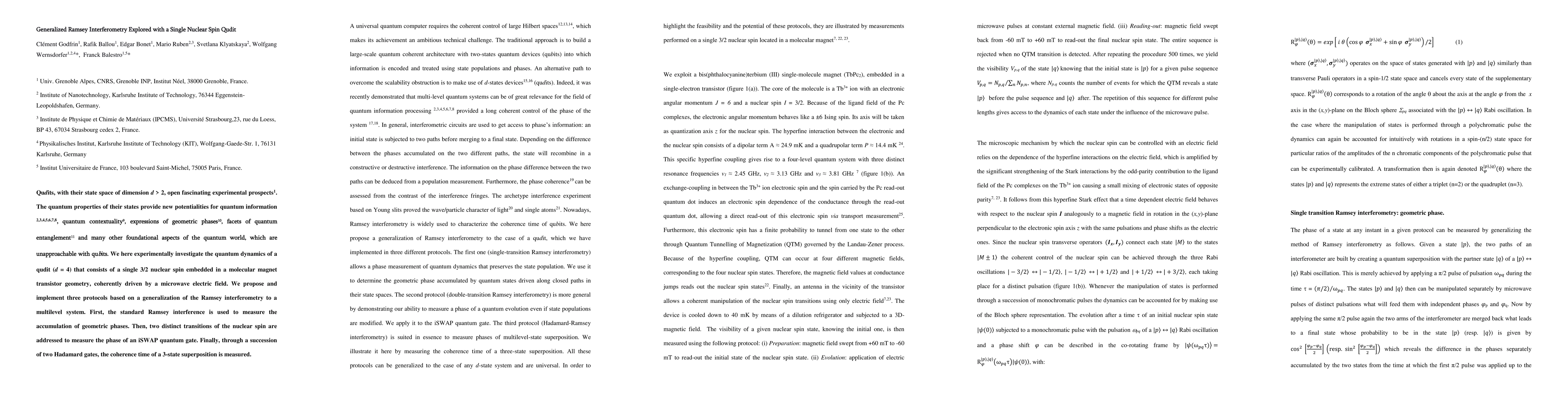 This paper explores the quantum dynamics of a qudit (d = 4) using a single nuclear spin in a molecular magnet transistor, implementing generalized Ramsey interferometry protocols to measure geometric phases, iSWAP gate phases, and coherence time of a 3-state superposition. The study highlights the unique quantum properties of higher-dimensional quantum systems beyond qubits.