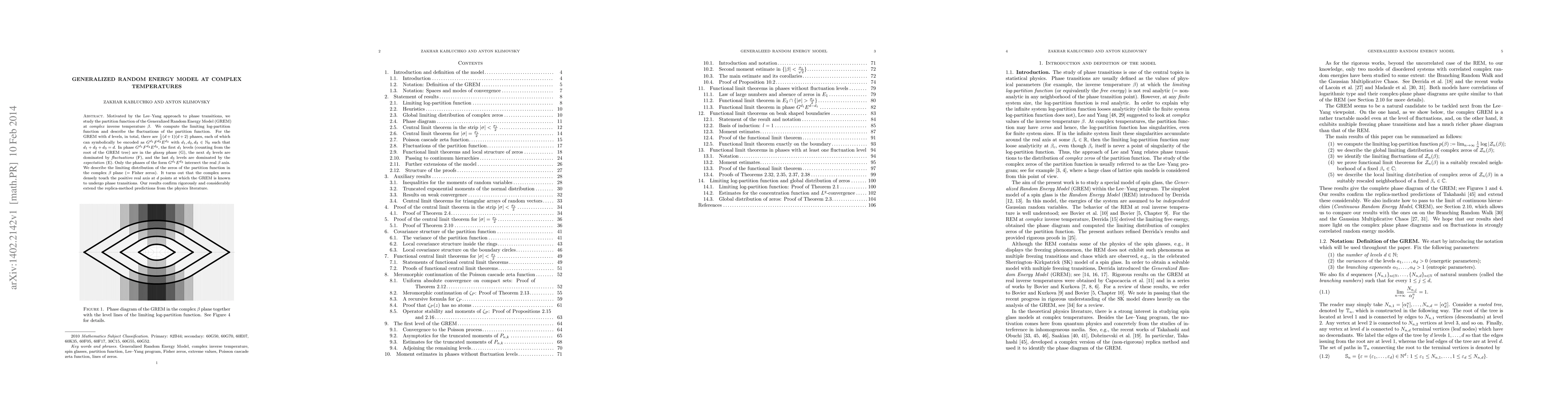 Motivated by the Lee--Yang approach to phase transitions, we study the partition function of the Generalized Random Energy Model (GREM) at complex inverse temperature $\beta$. We compute the limiting log-partition function and describe the fluctuations of the partition function. For the GREM with $d$ levels, in total, there are $\frac 12 (d+1)(d+2)$ phases, each of which can symbolically be encoded as $G^{d_1}F^{d_2}E^{d_3}$ with $d_1,d_2,d_3\in\mathbb{N}_0$ such that $d_1+d_2+d_3=d$. In phase $G^{d_1}F^{d_2}E^{d_3}$, the first $d_1$ levels (counting from the root of the GREM tree) are in the glassy phase (G), the next $d_2$ levels are dominated by fluctuations (F), and the last $d_3$ levels are dominated by the expectation (E). Only the phases of the form $G^{d_1}E^{d_3}$ intersect the real $\beta$ axis. We describe the limiting distribution of the zeros of the partition function in the complex $\beta$ plane (= Fisher zeros). It turns out that the complex zeros densely touch the positive real axis at $d$ points at which the GREM is known to undergo phase transitions. Our results confirm rigorously and considerably extend the replica-method predictions from the physics literature.