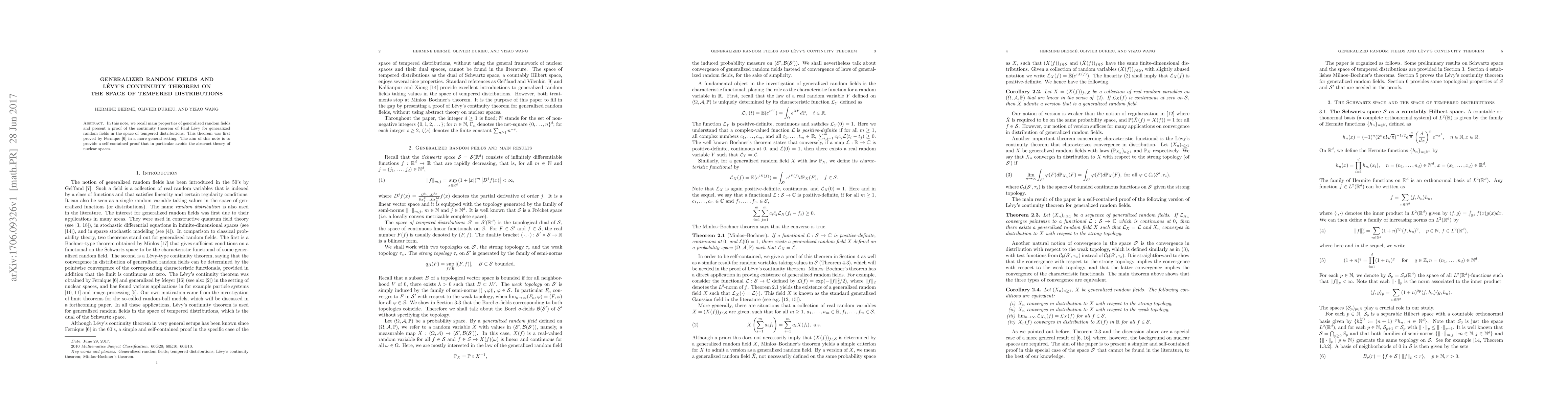 This paper reviews key properties of generalized random fields and offers a self-contained proof of Lévy's continuity theorem for these fields within the space of tempered distributions, avoiding the use of nuclear spaces. The original proof by Fernique in 1968 utilized a more general setting.