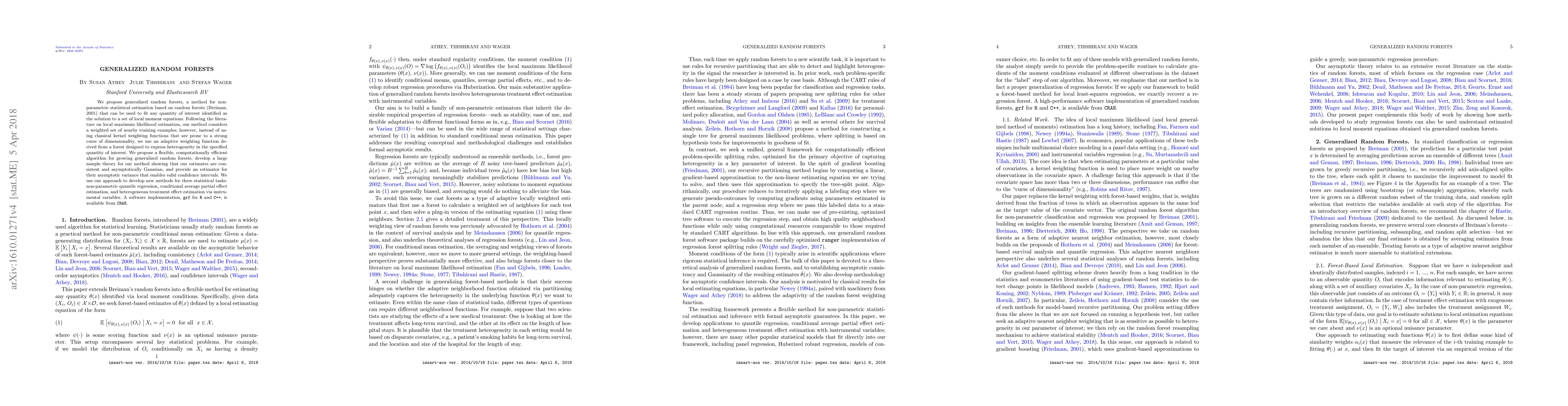 Generalized Random Forests propose a non-parametric statistical estimation method based on adaptive weighting functions in random forests to fit quantities of interest defined by local moment equations. The method offers consistent and asymptotically Gaussian estimates with valid confidence intervals, and is applied to non-parametric quantile regression, conditional average partial effect estimation, and heterogeneous treatment effect estimation.