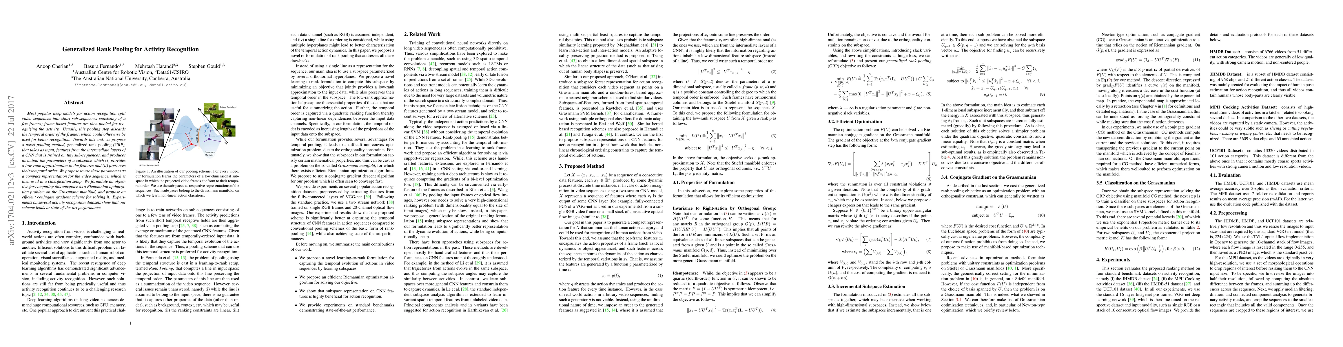 The paper proposes generalized rank pooling (GRP) to enhance action recognition by preserving temporal order in features from CNNs trained on short video sub-sequences. GRP optimizes a subspace that provides a low-rank approximation while maintaining temporal order, leading to state-of-the-art performance on activity recognition datasets.