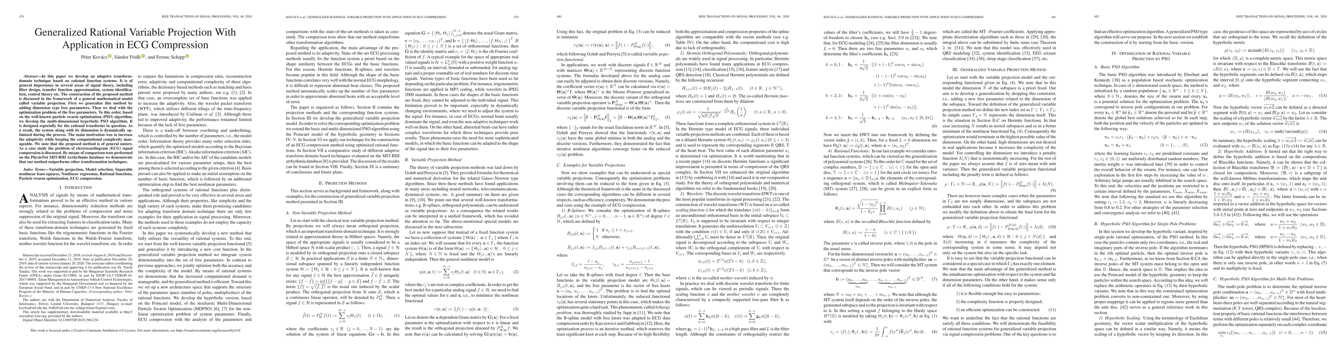 In this paper we develop an adaptive transform-domain technique based on rational function systems. It is of general importance in several areas of signal theory, including filter design, transfer function approximation, system identification, control theory etc. The construction of the proposed method is discussed in the framework of a general mathematical model called variable projection. First we generalize this method by adding dimension type free parameters. Then we deal with the optimization problem of the free parameters. To this order, based on the well-known particle swarm optimization (PSO) algorithm, we develop the multi-dimensional hyperbolic PSO algorithm. It is designed especially for the rational transforms in question. As a result, the system along with its dimension is dynamically optimized during the process. The main motivation was to increase the adaptivity while keeping the computational complexity manageable. We note that the proposed method is of general nature. As a case study the problem of electrocardiogram (ECG) signal compression is discussed. By means of comparison tests performed on the PhysioNet MIT-BIH Arrhythmia database we demonstrate that our method outperforms other transformation techniques.
