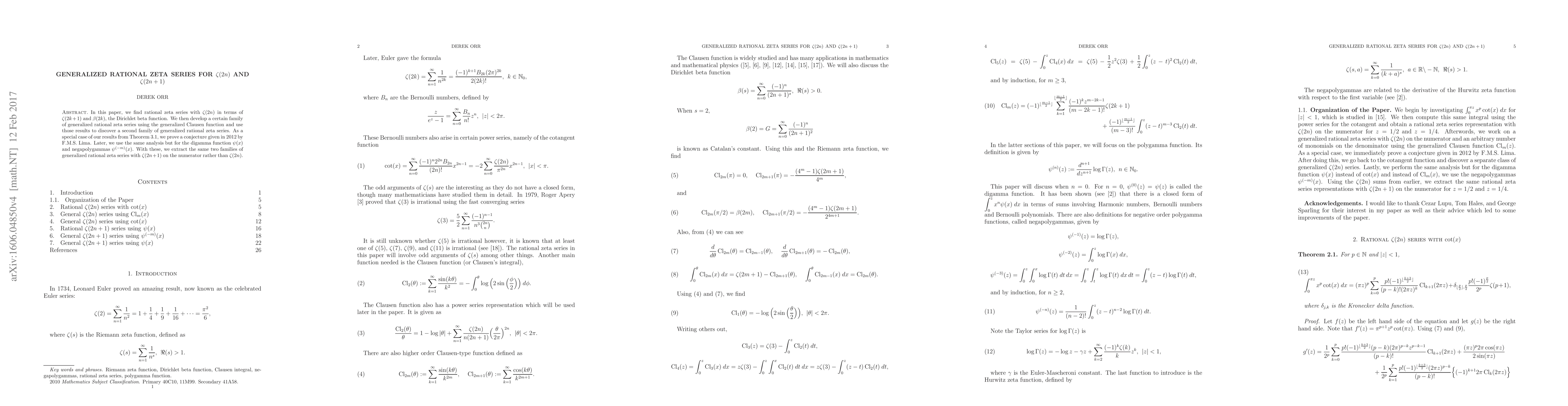 This paper introduces rational zeta series linking $\zeta(2n)$ and $\zeta(2n+1)$ through $\beta(2k)$ and $\zeta(2k+1)$, develops generalized series using the Clausen function, and proves a conjecture from 2012. It extends these findings to the digamma and negapolygamma functions.