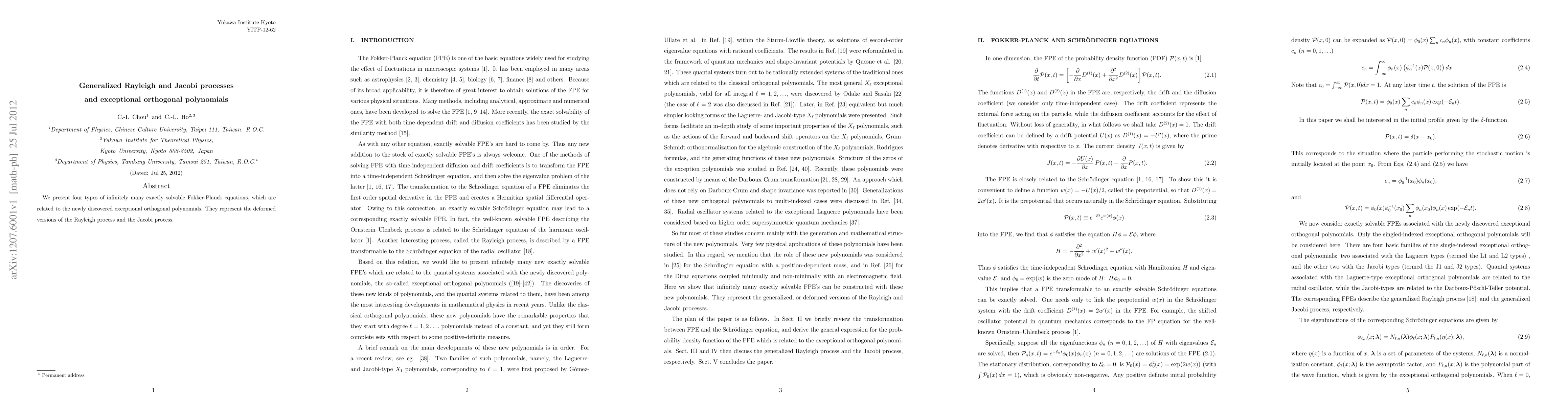 This paper introduces four new types of solvable Fokker-Planck equations related to exceptional orthogonal polynomials, which can be seen as deformed versions of the Rayleigh and Jacobi processes.