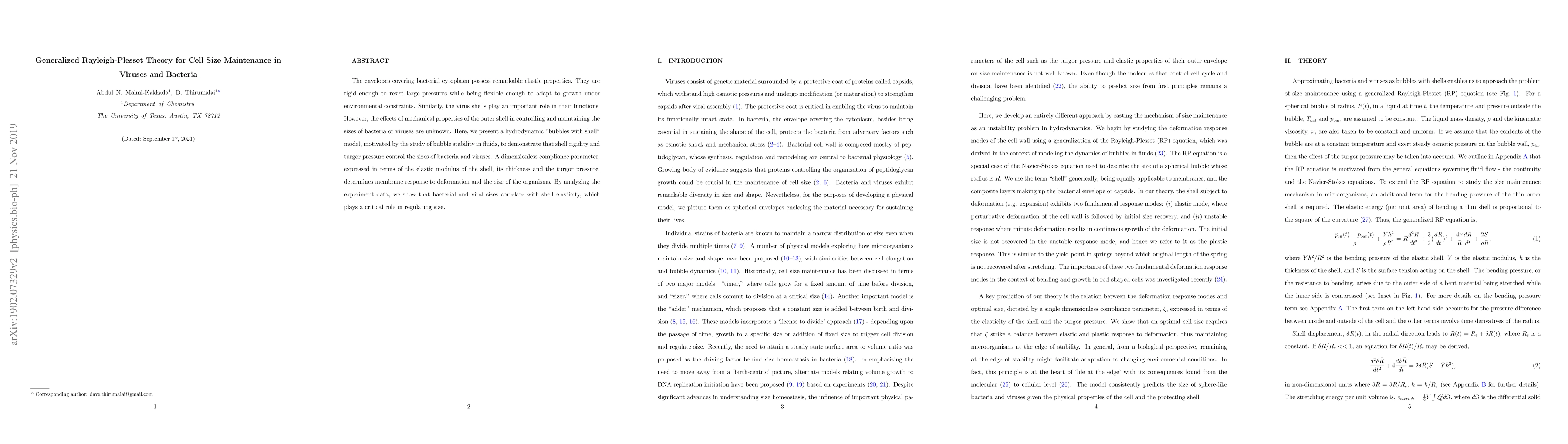 This paper presents a hydrodynamic model to explain how shell rigidity and turgor pressure control the sizes of bacteria and viruses. The study introduces a dimensionless compliance parameter that correlates bacterial and viral sizes with shell elasticity, demonstrating its critical role in size regulation.