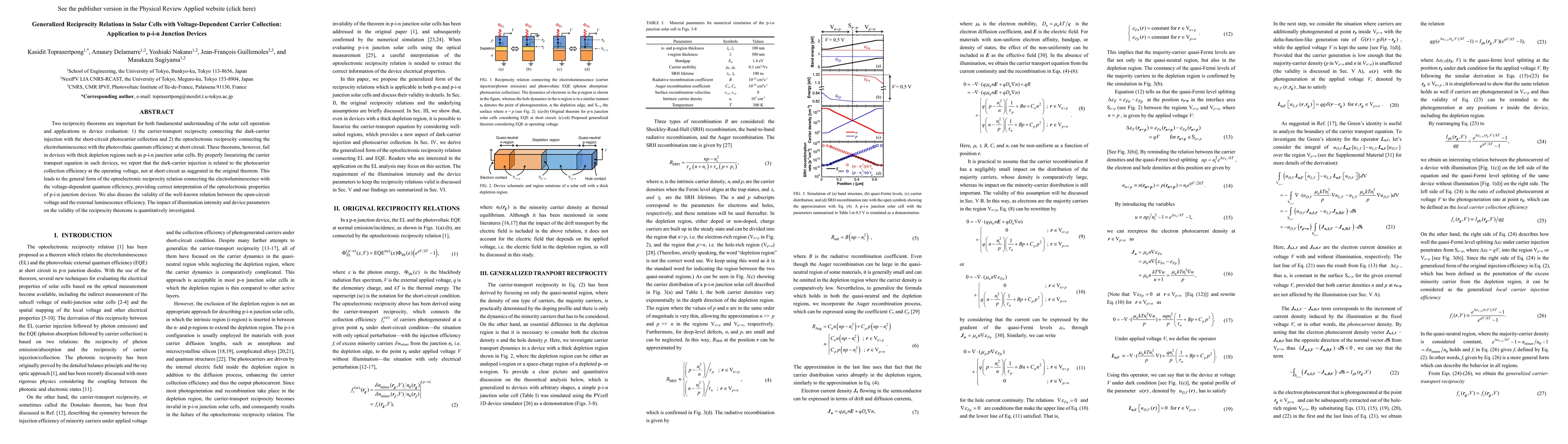 This paper generalizes reciprocity relations in solar cells, particularly for p-i-n junction devices, by showing that the original theorems fail due to thick depletion regions. It proposes a new optoelectronic reciprocity relation that accounts for voltage-dependent quantum efficiency, thus providing a more accurate interpretation of p-i-n junction solar cells' optoelectronic properties.