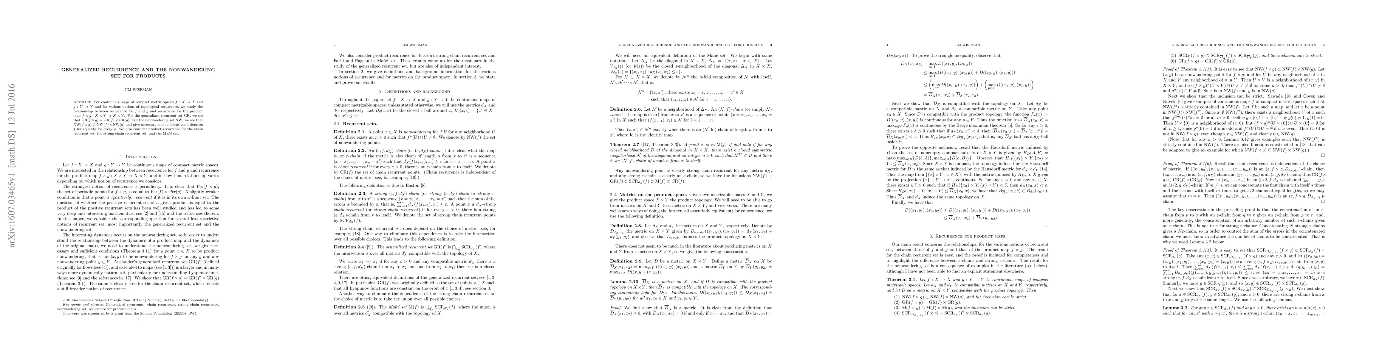 This paper investigates how topological recurrence in continuous maps of compact metric spaces translates to the product space. It shows that the generalized recurrent set for the product map equals the product of the sets for the individual maps, and provides conditions for the nonwandering set equality in the product space.