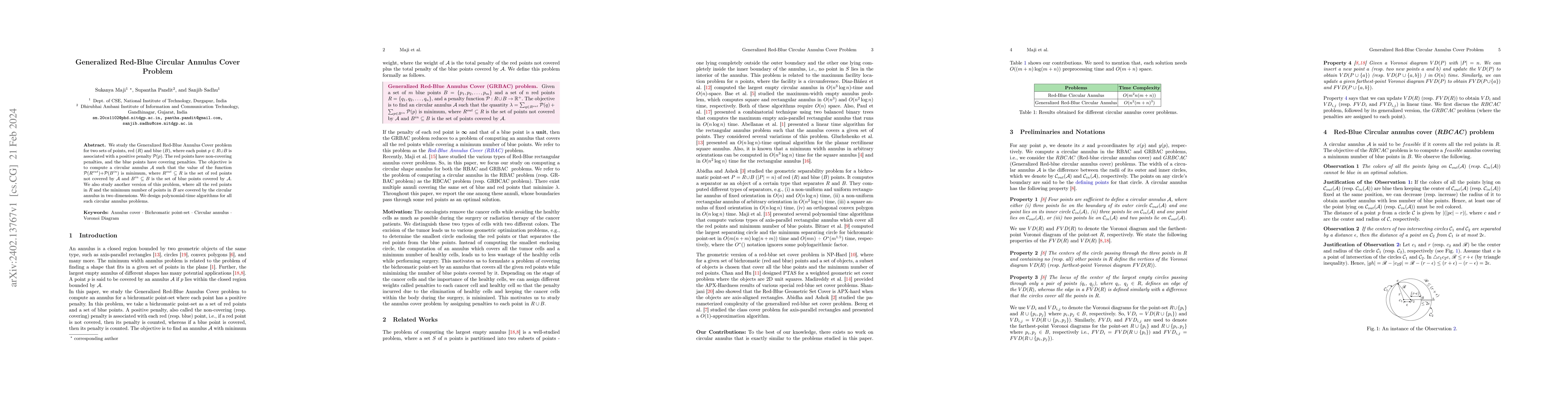This paper investigates the Generalized Red-Blue Annulus Cover problem, aiming to find a circular annulus that minimizes penalties for uncovered red points and covered blue points. It also explores a variant where all red points must be covered, and designs polynomial-time algorithms for both versions.