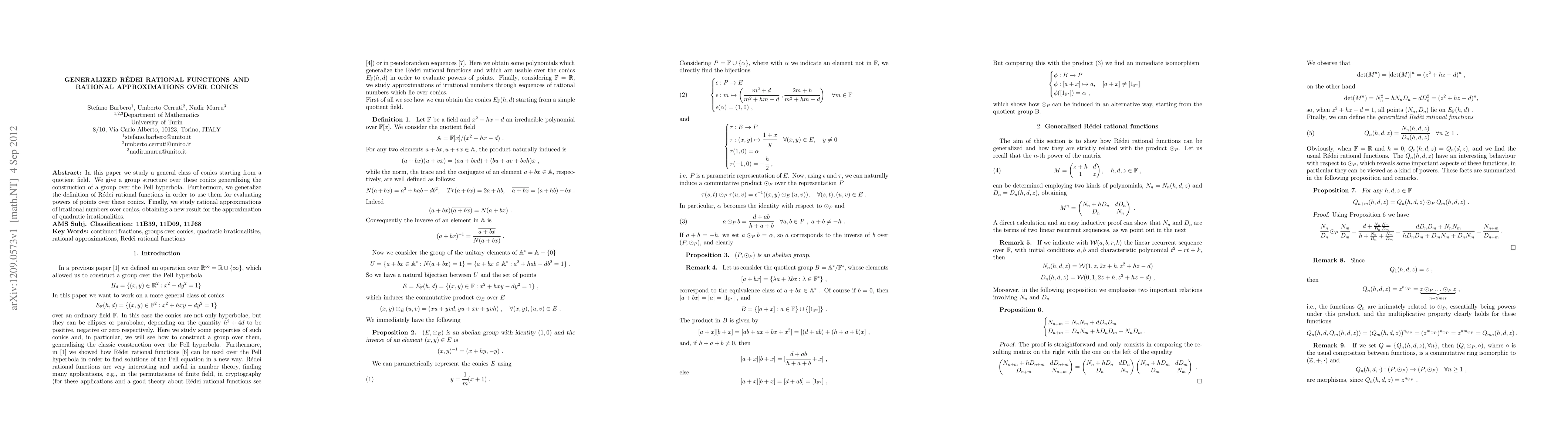 In this paper we study a general class of conics starting from a quotient field. We give a group structure over these conics generalizing the construction of a group over the Pell hyperbola. Furthermore, we generalize the definition of R\'edei rational functions in order to use them for evaluating powers of points over these conics. Finally, we study rational approximations of irrational numbers over conics, obtaining a new result for the approximation of quadratic irrationalities.