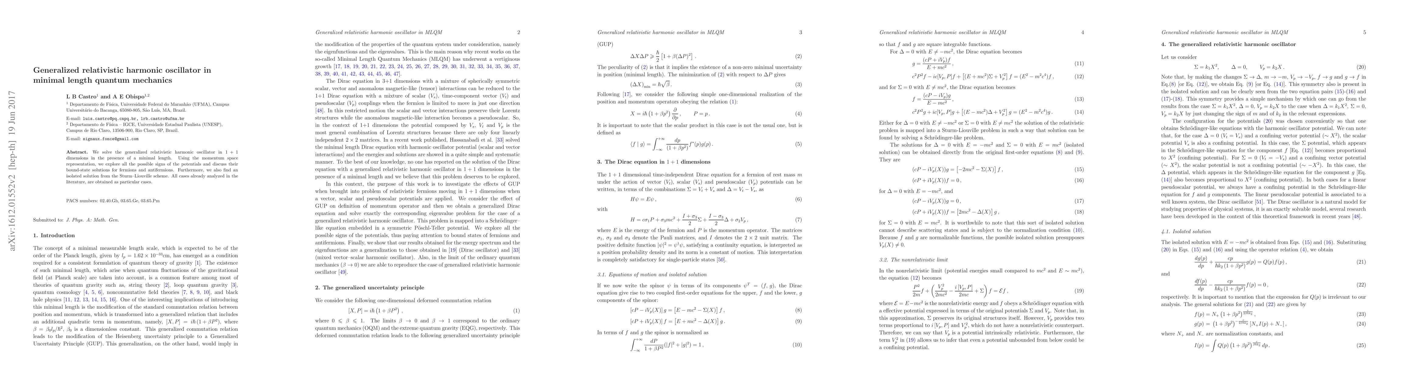 We solve the generalized relativistic harmonic oscillator in 1+1 dimensions in the presence of a minimal length. Using the momentum space representation, we explore all the possible signs of the potentials and discuss their bound-state solutions for fermion and antifermions. Furthermore, we also find an isolated solution from the Sturm-Liouville scheme. All cases already analyzed in the literature, are obtained as particular cases.