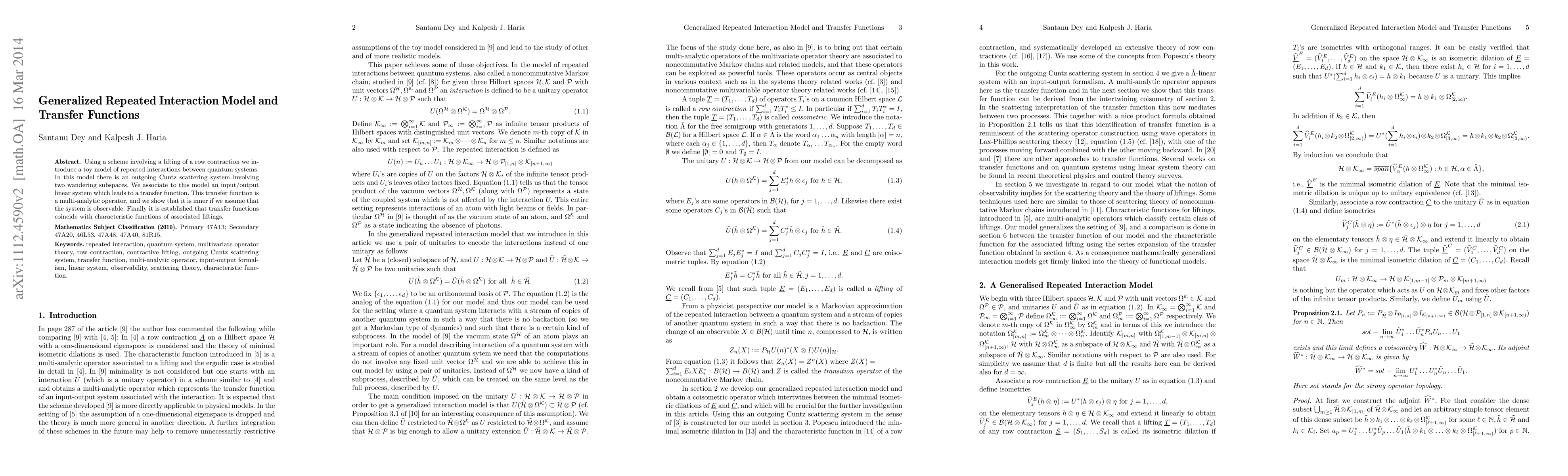 Using a scheme involving a lifting of a row contraction we introduce a toy model of repeated interactions between quantum systems. In this model there is an outgoing Cuntz scattering system involving two wandering subspaces. We associate to this model an input/output linear system which leads to a transfer function. This transfer function is a multi-analytic operator, and we show that it is inner if we assume that the system is observable. Finally it is established that transfer functions coincide with characteristic functions of associated liftings.