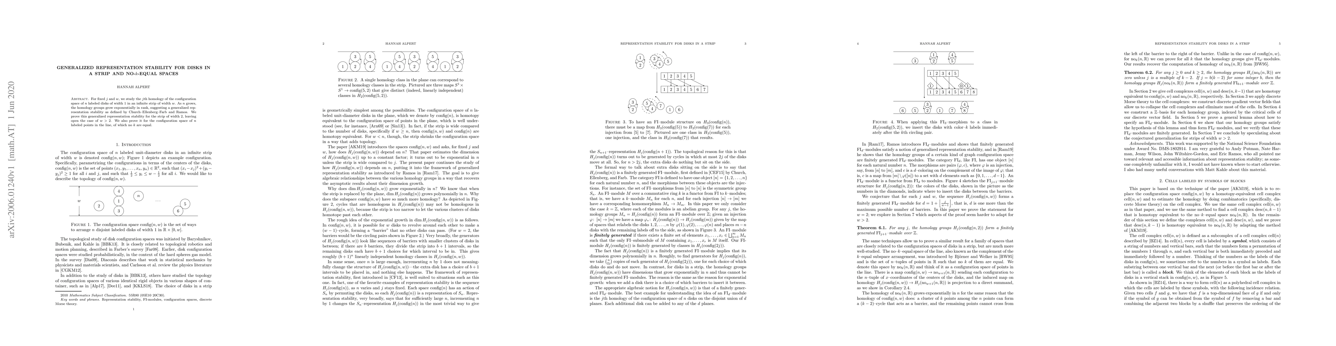 This paper investigates the j-th homology of configuration spaces of labeled disks in an infinite strip and points in a line, demonstrating generalized representation stability as n grows. The study confirms this stability for strips of width 2 and for configurations of points where no k are equal.