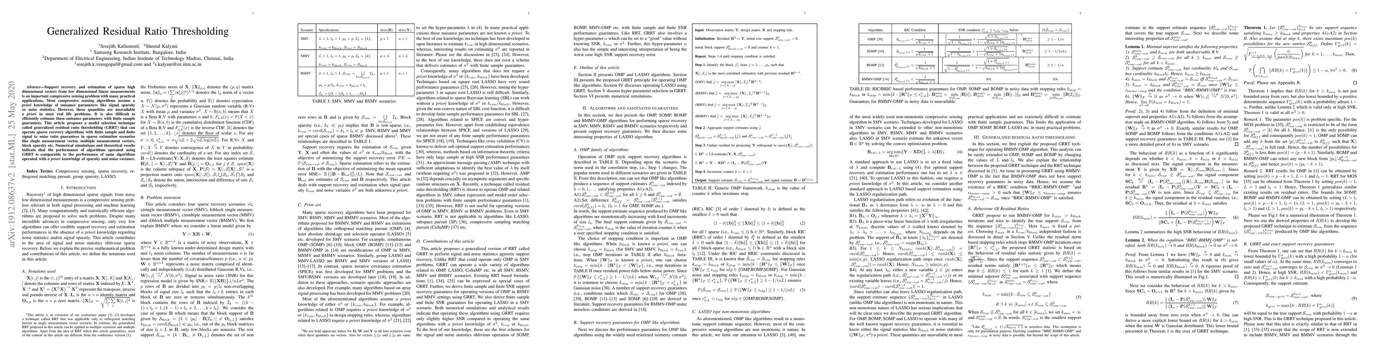This paper introduces generalized residual ratio thresholding (GRRT) for simultaneous orthogonal matching pursuit (SOMP) and block OMP (BOMP) to recover sparse support without requiring prior knowledge of signal sparsity or noise variance, providing theoretical guarantees and demonstrating comparable performance through simulations.