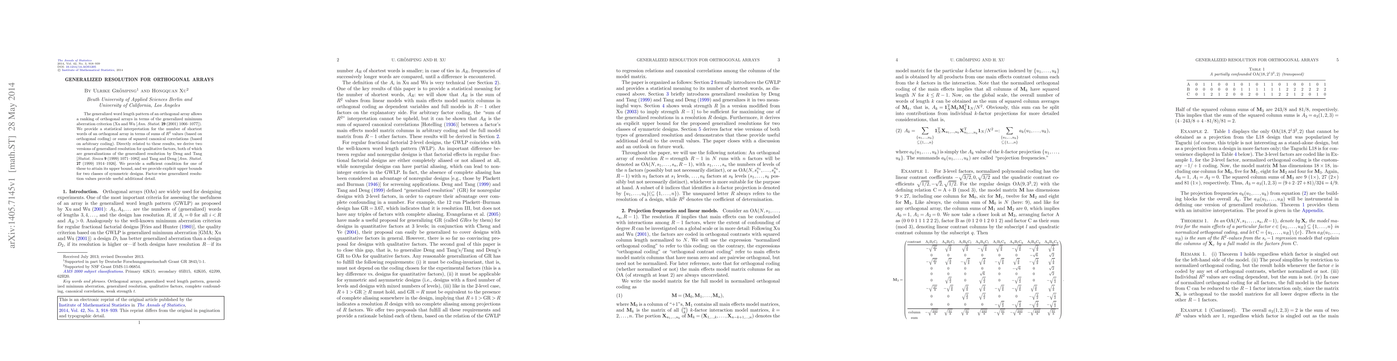 The generalized word length pattern of an orthogonal array allows a ranking of orthogonal arrays in terms of the generalized minimum aberration criterion (Xu and Wu [Ann. Statist. 29 (2001) 1066-1077]). We provide a statistical interpretation for the number of shortest words of an orthogonal array in terms of sums of $R^2$ values (based on orthogonal coding) or sums of squared canonical correlations (based on arbitrary coding). Directly related to these results, we derive two versions of generalized resolution for qualitative factors, both of which are generalizations of the generalized resolution by Deng and Tang [Statist. Sinica 9 (1999) 1071-1082] and Tang and Deng [Ann. Statist. 27 (1999) 1914-1926]. We provide a sufficient condition for one of these to attain its upper bound, and we provide explicit upper bounds for two classes of symmetric designs. Factor-wise generalized resolution values provide useful additional detail.