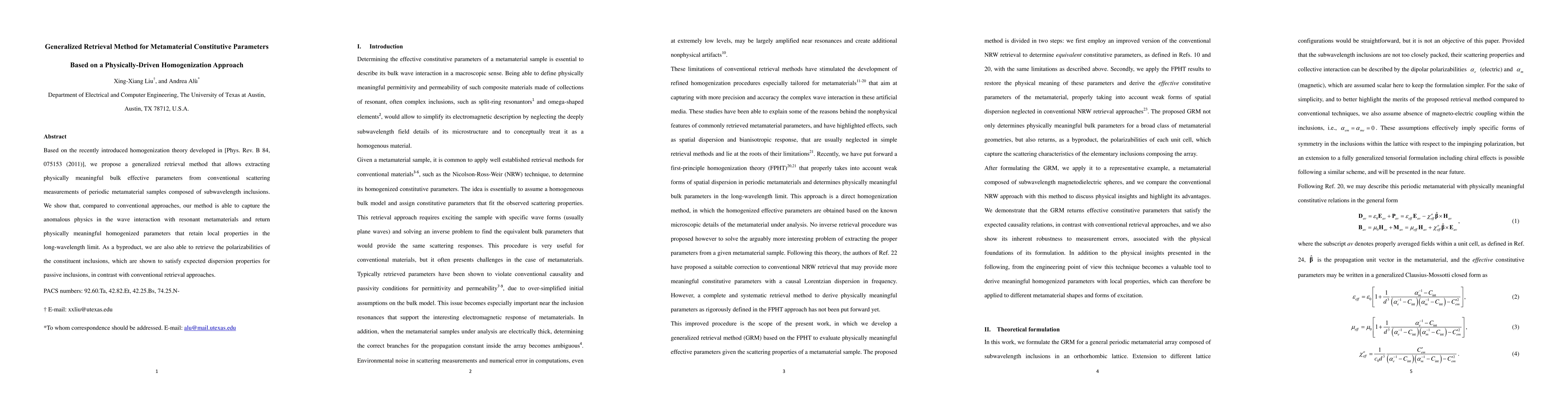 This paper proposes a generalized retrieval method based on homogenization theory to extract effective bulk parameters from scattering measurements of metamaterials. The method captures anomalous wave interactions and provides physically meaningful homogenized parameters, along with the polarizabilities of constituent inclusions.
