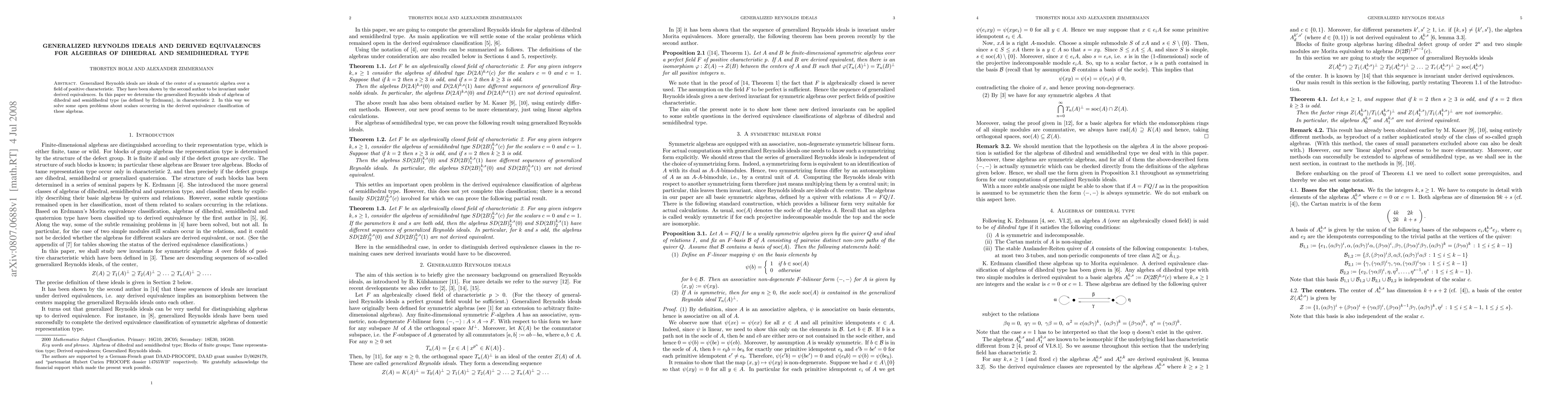 Generalized Reynolds ideals are ideals of the center of a symmetric algebra over a field of positive characteristic. They have been shown by the second author to be invariant under derived equivalences. In this paper we determine the generalized Reynolds ideals of algebras of dihedral and semidihedral type (as defined by Erdmann), in characteristic 2. In this way we solve some open problems about scalars occurring in the derived equivalence classification of these algebras.