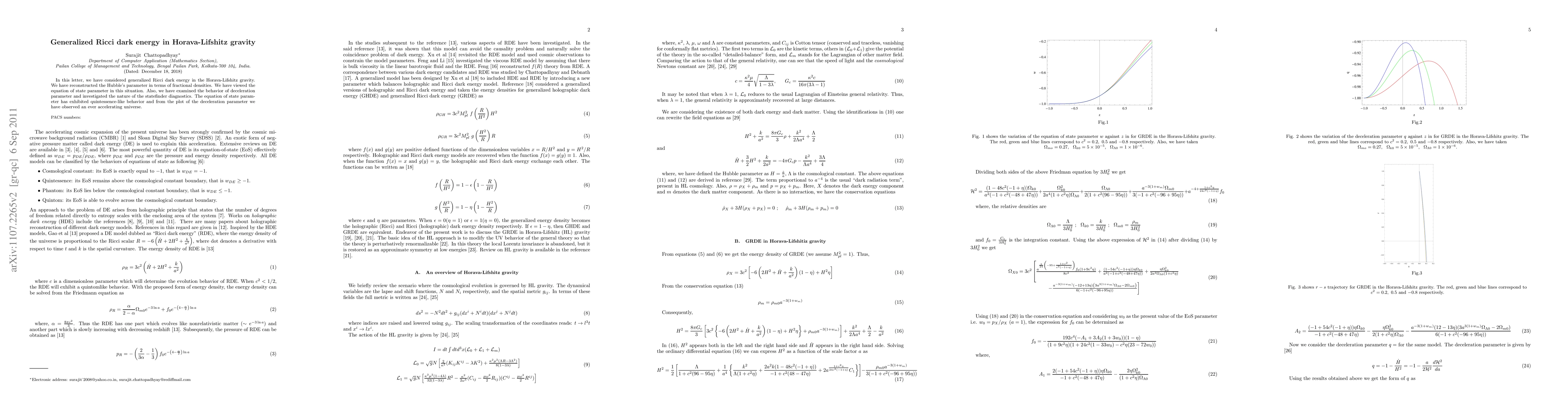 This paper explores generalized Ricci dark energy within the framework of Horava-Lifshitz gravity, reconstructing the Hubble parameter in terms of fractional densities and examining the equation of state, deceleration parameter, and statefinder diagnostics. The study finds quintessence-like behavior and an ever-accelerating universe.