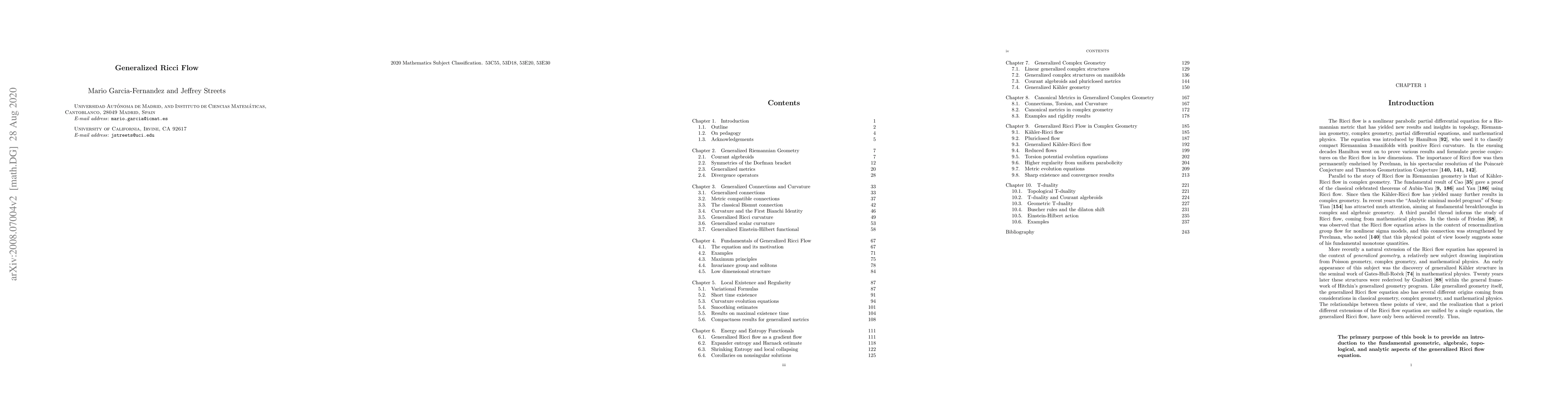 This book introduces generalized Ricci flow as a method to construct canonical metrics in Riemannian and complex geometry, extending the classical Ricci flow and Hamilton/Perelman theory, and applying it to complex geometry, including pluriclosed flow and generalized Kähler-Ricci flow. It also explores T-duality in a mathematical context.