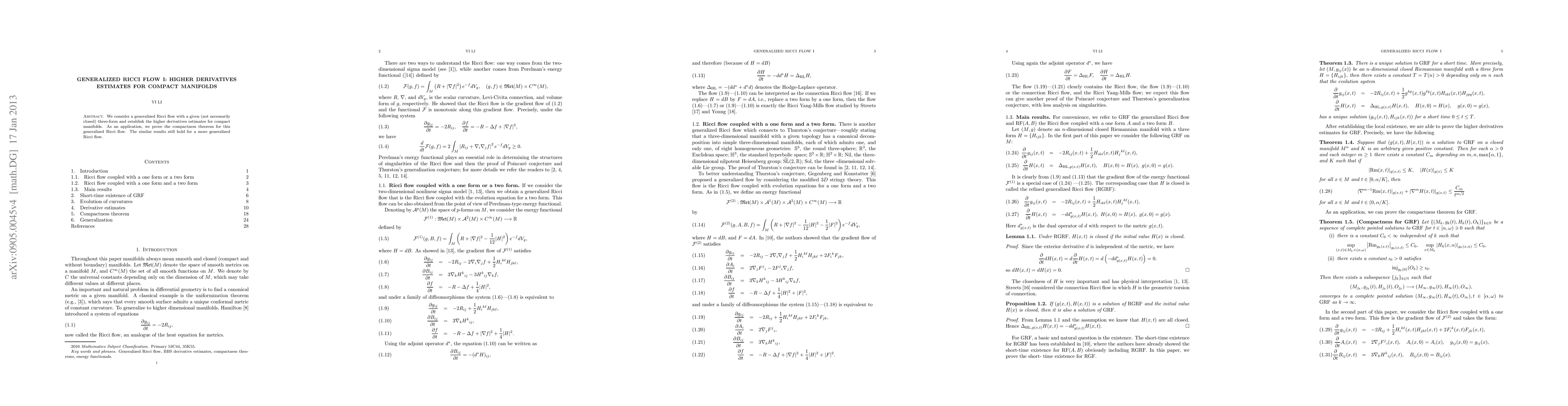 Summary: This paper develops higher derivatives estimates for a generalized Ricci flow with a three-form on compact manifolds, proving a compactness theorem for this flow and demonstrating similar results hold for more generalized flows.