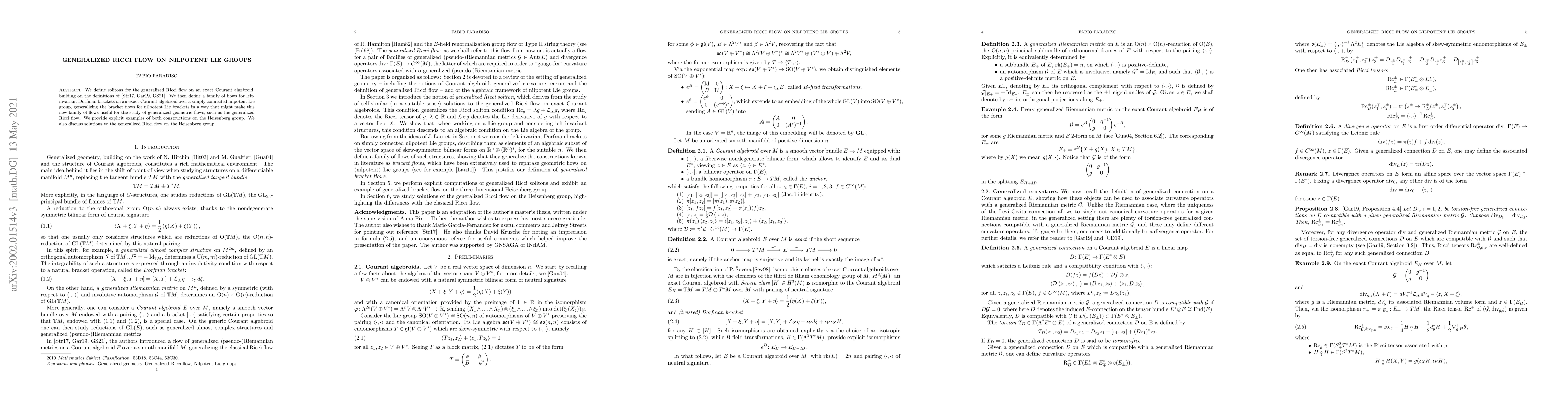 We define solitons for the generalized Ricci flow on an exact Courant algebroid, building on the definitions of M. Garcia-Fernandez and J. Streets. We then define a family of flows for left-invariant Dorfman brackets on an exact Courant algebroid over a simply connected nilpotent Lie group, generalizing the bracket flows for nilpotent Lie brackets in a way that might make this new family of flows useful for the study of generalized geometric flows, such as the generalized Ricci flow. We provide explicit examples of both constructions on the Heisenberg group. We also discuss solutions to the generalized Ricci flow on the Heisenberg group.