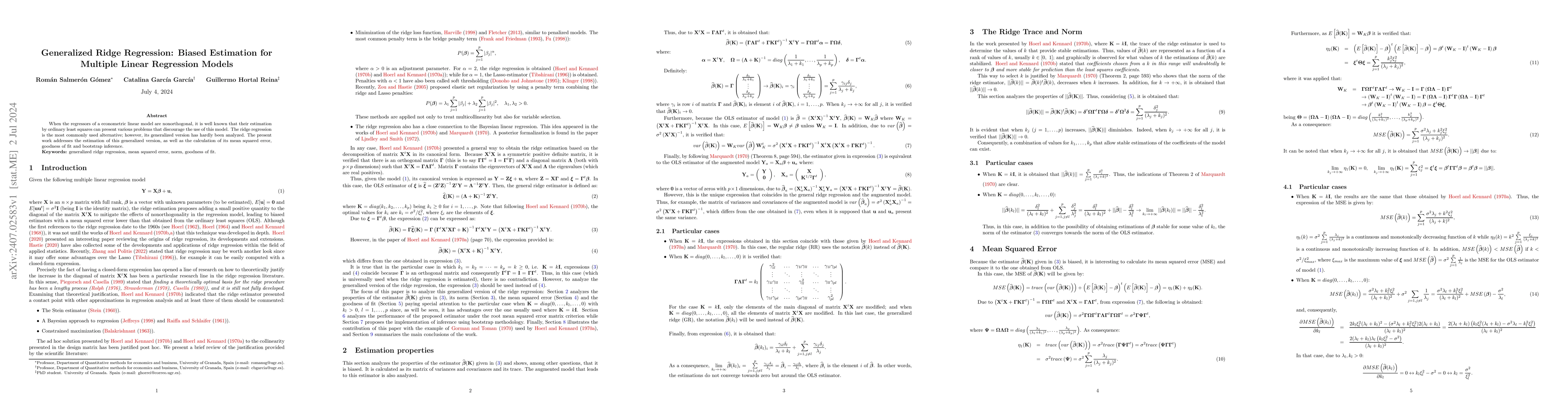 Summary: This paper explores the generalized ridge regression method for multiple linear regression models where regressors are nonorthogonal, providing estimation techniques, calculating mean squared error, and assessing model fit and bootstrap inference.