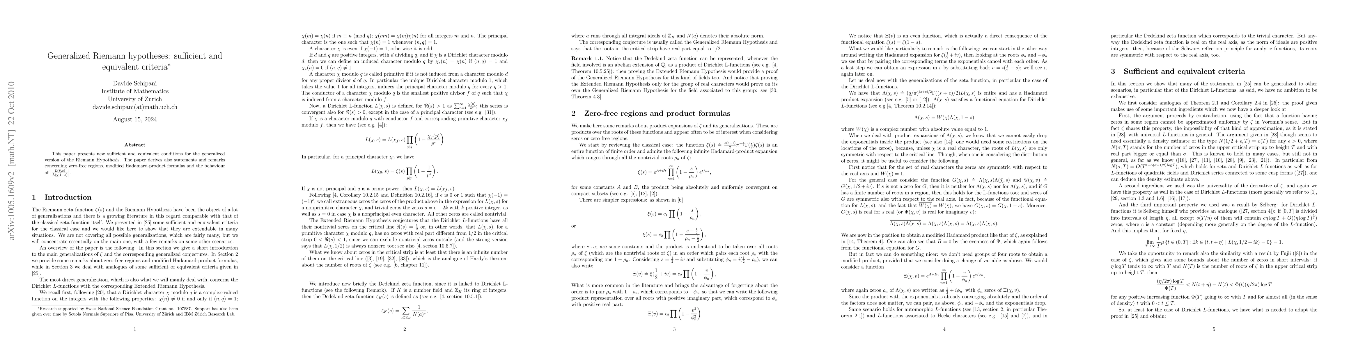 This paper introduces new criteria for the generalized Riemann Hypothesis, providing sufficient and equivalent conditions, and discusses zero-free regions, modified Hadamard-product formulas, and the behavior of the function $|\frac{L(\bar{\chi},s)}{L(\chi,1-s)}|$.