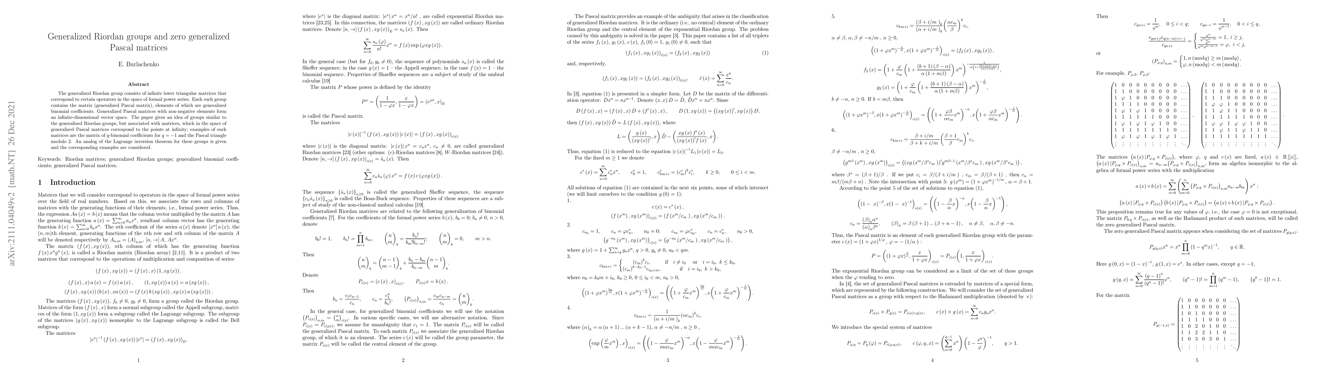 The paper explores generalized Riordan groups, which consist of infinite lower triangular matrices linked to formal power series operators, and introduces zero generalized Pascal matrices. It also discusses analogous groups associated with matrices corresponding to points at infinity, providing an analog of the Lagrange inversion theorem.