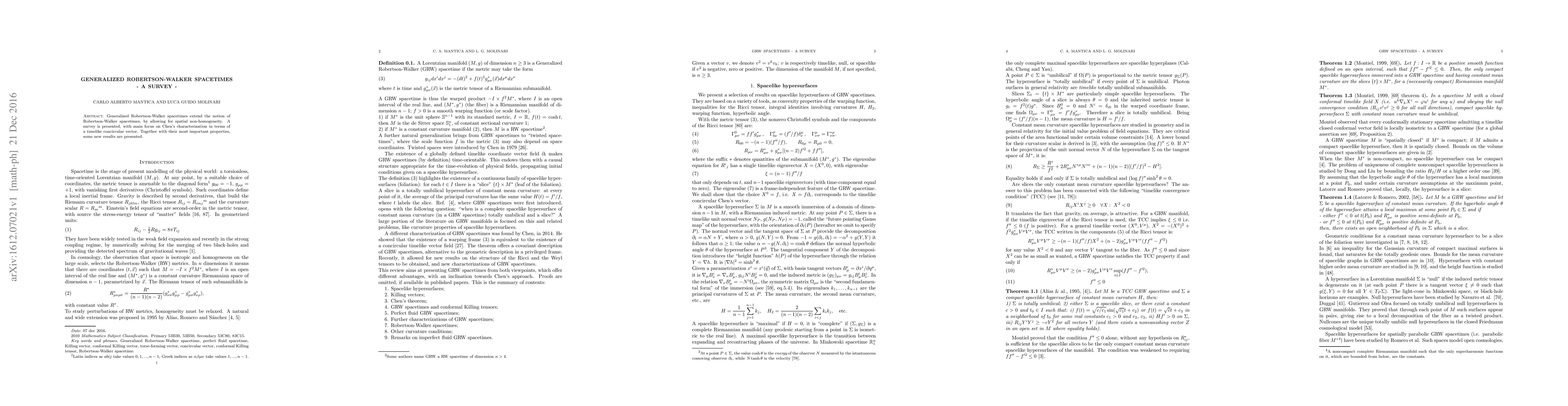 Generalized Robertson-Walker spacetimes extend the notion of Robertson-Walker spacetimes, by allowing for spatial non-homogeneity. A survey is presented, with main focus on Chen's characterization in terms of a timelike concircular vector. Together with their most important properties, some new results are presented.