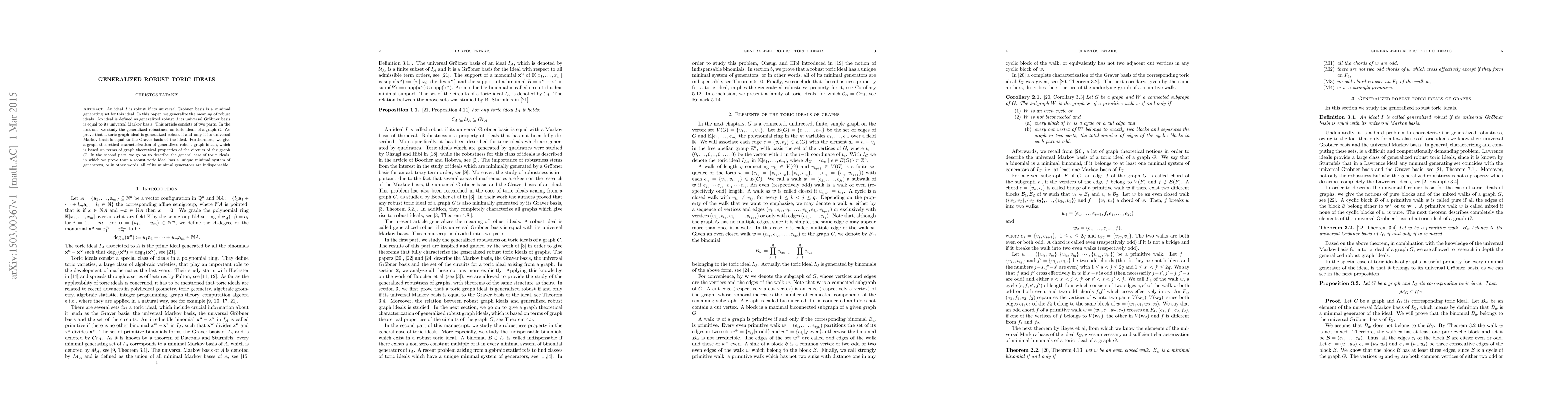 An ideal I is robust if its universal Gr\"obner basis is a minimal generating set for this ideal. In this paper, we generalize the meaning of robust ideals. An ideal is defined as generalized robust if its universal Gr\"obner basis is equal to its universal Markov basis. This article consists of two parts. In the first one, we study the generalized robustness on toric ideals of a graph G. We prove that a toric graph ideal is generalized robust if and only if its universal Markov basis is equal to the Graver basis of the ideal. Furthermore, we give a graph theoretical characterization of generalized robust graph ideals, which is based on terms of graph theoretical properties of the circuits of the graph G. In the second part, we go on to describe the general case of toric ideals, in which we prove that a robust toric ideal has a unique minimal system of generators, or in other words, all of its minimal generators are indispensable.