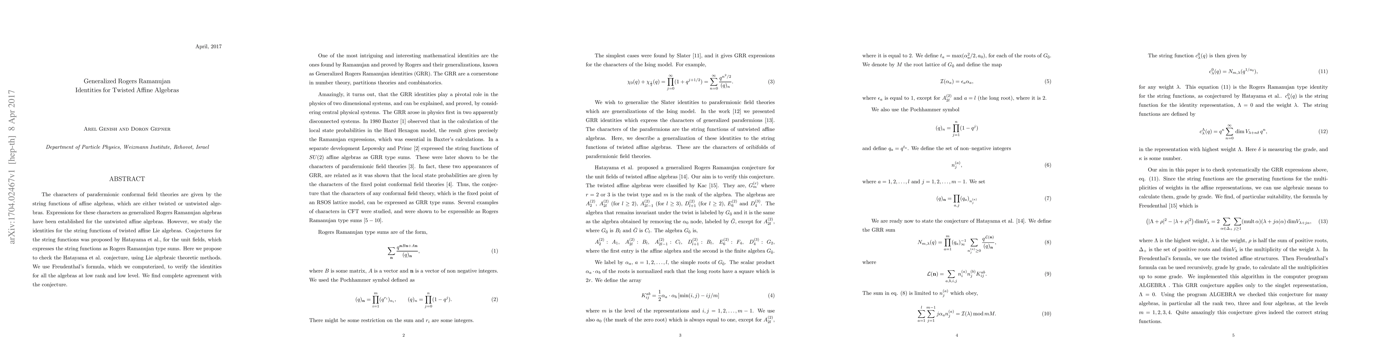 The characters of parafermionic conformal field theories are given by the string functions of affine algebras, which are either twisted or untwisted algebras. Expressions for these characters as generalized Rogers Ramanujan algebras have been established for the untwisted affine algebras. However, we study the identities for the string functions of twisted affine Lie algebras. Conjectures for the string functions was proposed by Hatayama et al., for the unit fields, which expresses the string functions as Rogers Ramanujan type sums. Here we propose to check the Hatayama et al. conjecture, using Lie algebraic theoretic methods. We use Freudenthal's formula, which we computerized, to verify the identities for all the algebras at low rank and low level. We find complete agreement with the conjecture.