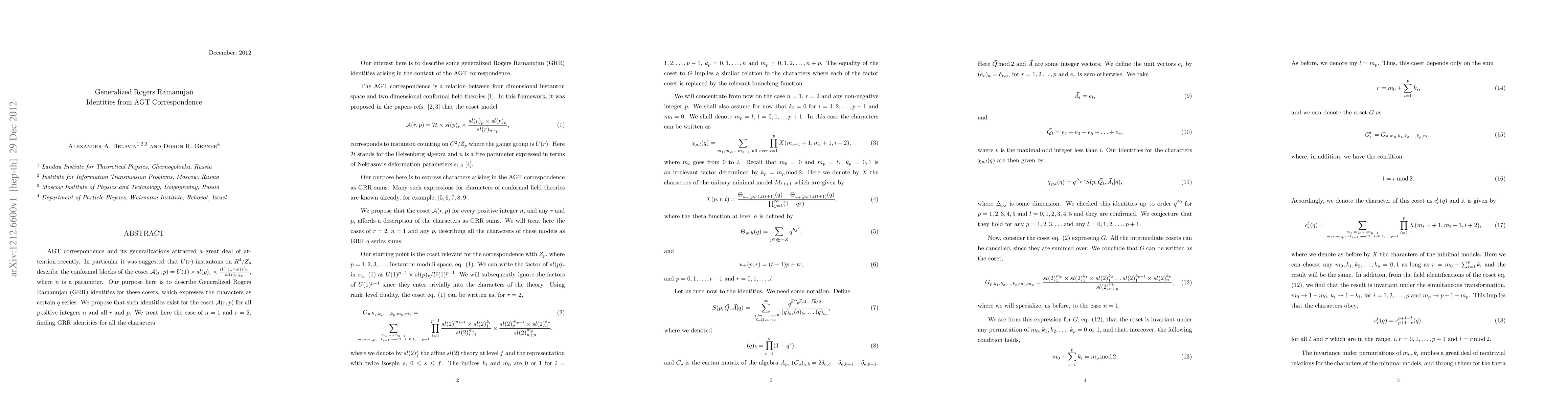 AGT correspondence and its generalizations attracted a great deal of attention recently. In particular it was suggested that $U(r)$ instantons on $R^4/Z_p$ describe the conformal blocks of the coset ${\cal A}(r,p)=U(1)\times sl(p)_r\times {sl(r)_p\times sl(r)_n\over sl(r)_{n+p}}$, where $n$ is a parameter. Our purpose here is to describe Generalized Rogers Ramanujan (GRR) identities for these cosets, which expresses the characters as certain $q$ series. We propose that such identities exist for the coset ${\cal A}(r,p)$ for all positive integers $n$ and all $r$ and $p$. We treat here the case of $n=1$ and $r=2$, finding GRR identities for all the characters.