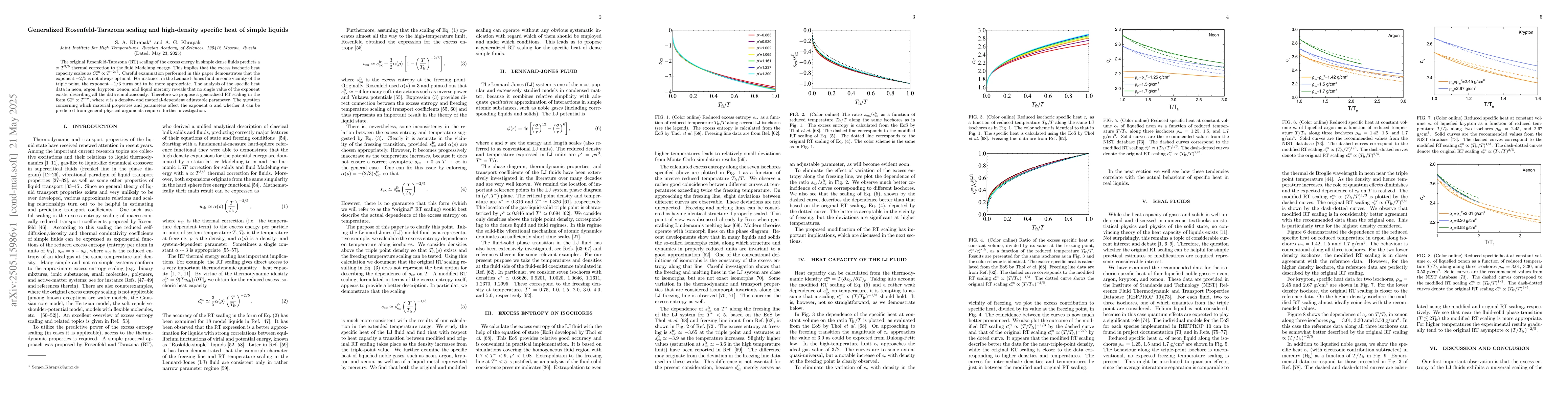 The paper examines the original Rosenfeld-Tarazona (RT) scaling of excess energy in dense fluids, comparing it with specific heat data from various simple liquids like neon, argon, krypton, xenon, and mercury.