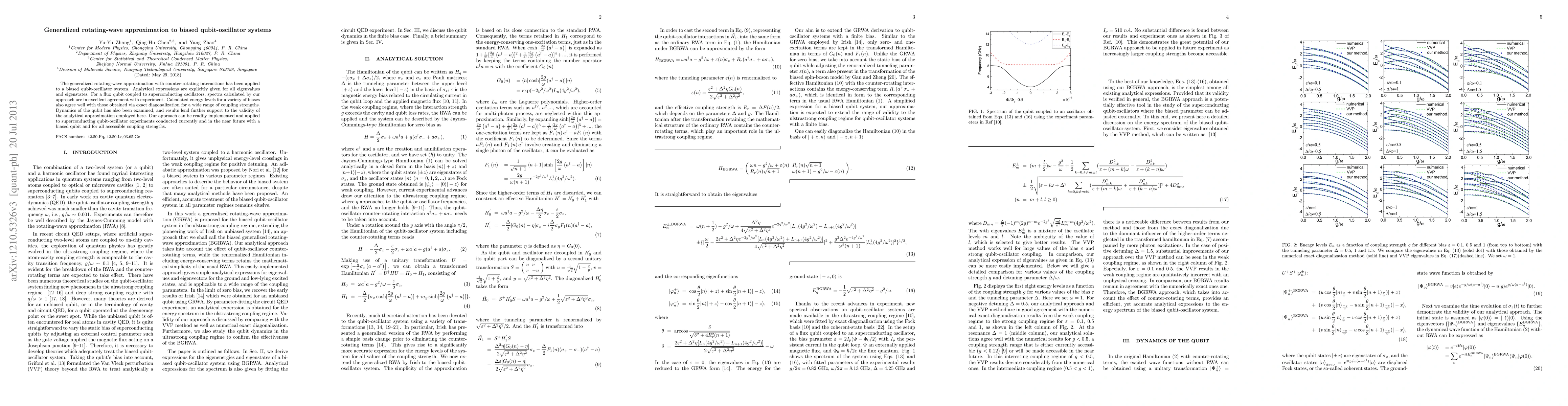 This paper presents a generalized rotating-wave approximation to analyze biased qubit-oscillator systems, providing analytical expressions for eigenvalues and eigenstates. The method accurately matches experimental data for flux qubits coupled to superconducting oscillators and agrees well with exact diagonalization results across various biases.