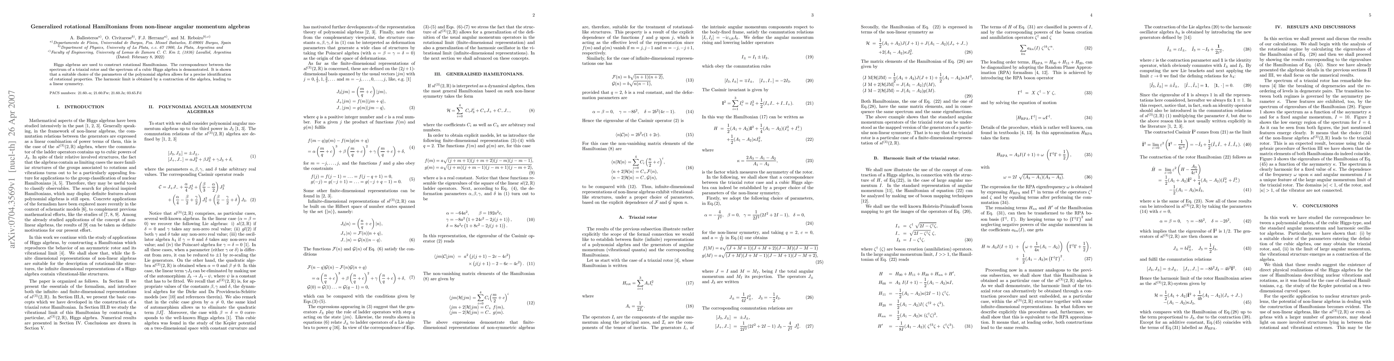 This paper constructs rotational Hamiltonians using Higgs algebras and demonstrates the correspondence between the triaxial rotor's spectrum and cubic Higgs algebra. It shows how parameter choices in the polynomial algebra precisely identify rotational properties, and achieves the harmonic limit through algebra contraction, resulting in linear symmetry.