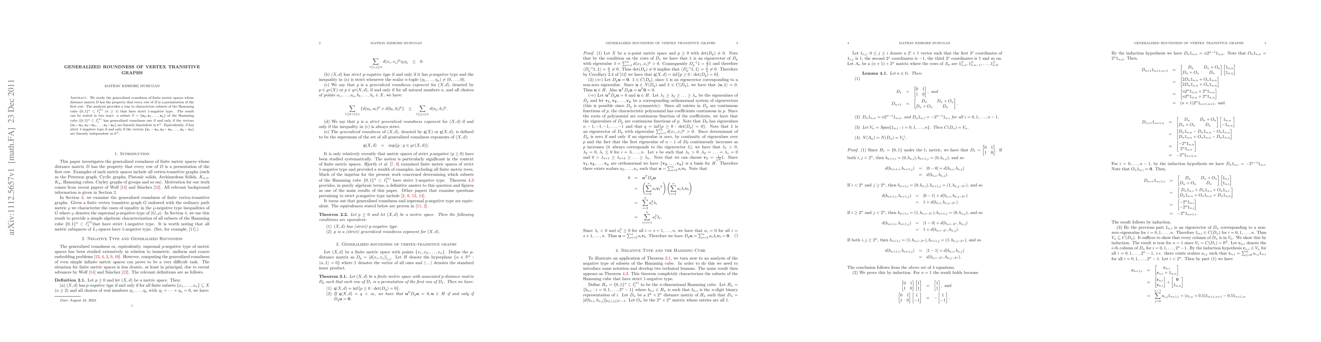 This paper investigates the generalized roundness of vertex transitive graphs through the property of distance matrices, revealing a characterization of subsets of the Hamming cube with strict 1-negative type. The study concludes that such subsets have generalized roundness one if their difference vectors are linearly dependent.