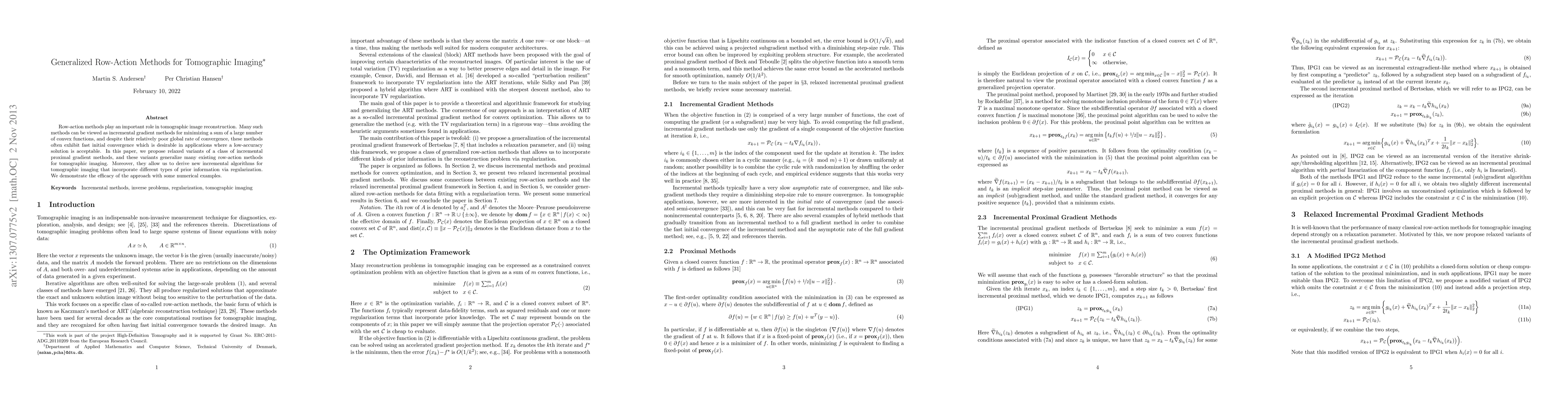 This paper proposes generalized incremental proximal gradient methods that extend existing row-action techniques for tomographic imaging, incorporating various types of prior information through regularization. Numerical examples demonstrate the effectiveness of the new algorithms.