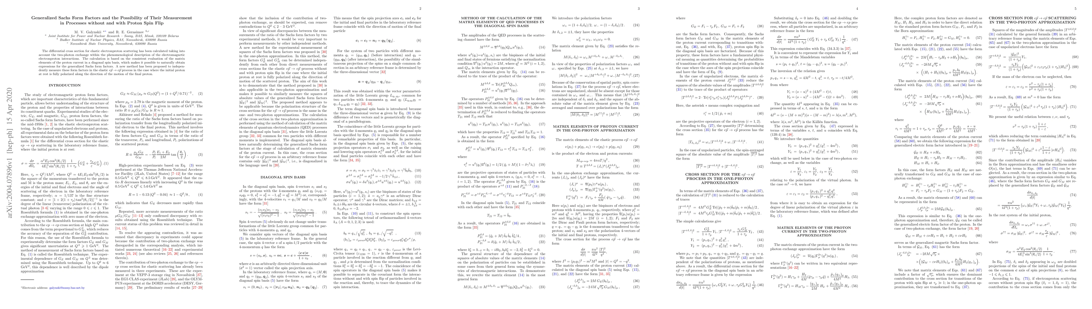This paper calculates the differential cross section for elastic electron-proton scattering, incorporating two-photon exchange and evaluating the generalized Sachs form factors. A novel method is proposed to measure these form factors in processes involving proton spin flip.