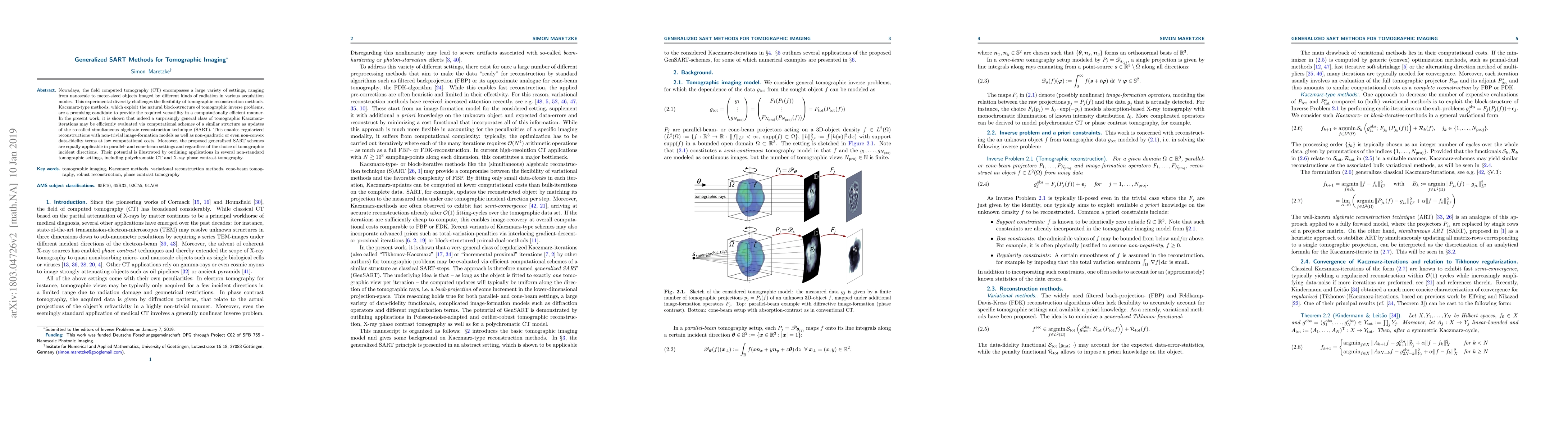 This paper proposes generalized SART methods for versatile tomographic imaging, demonstrating their efficiency in various CT settings through computational schemes similar to SART updates. These methods enable regularized reconstructions with complex image-formation models and low computational costs, applicable across parallel- and cone-beam settings.