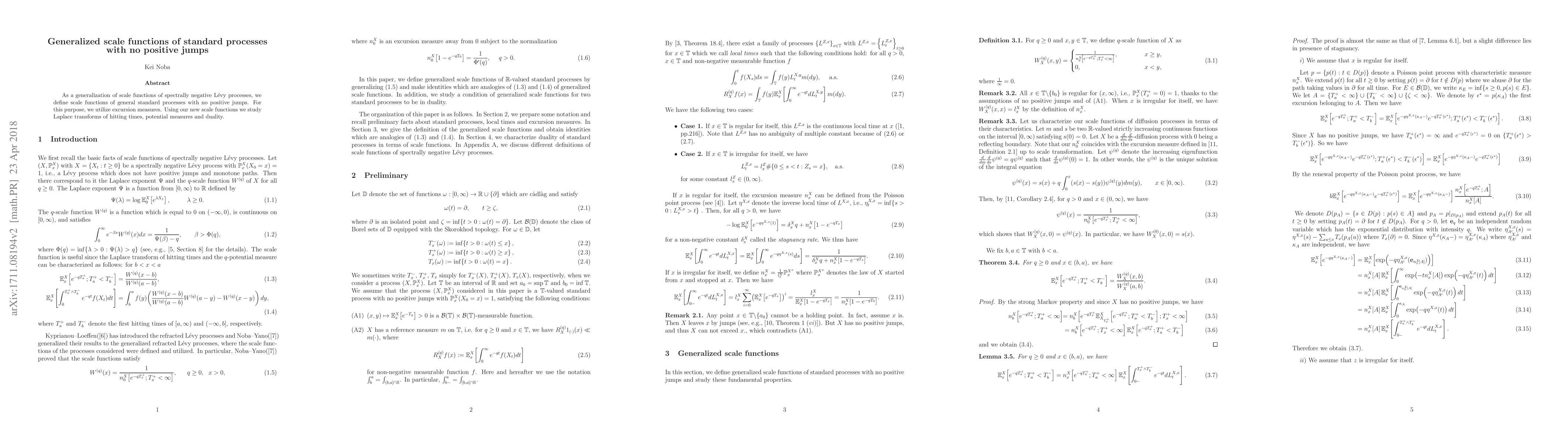 This paper generalizes scale functions for standard processes without positive jumps, employing excursion measures. It investigates the Laplace transforms of hitting times, potential measures, and explores duality using these new scale functions.