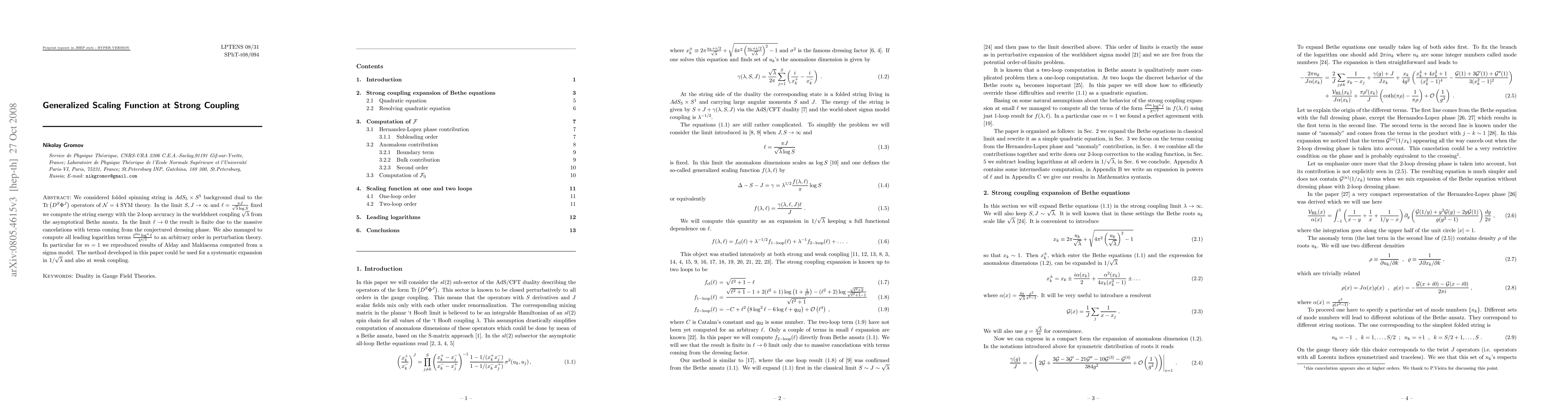 We considered folded spinning string in AdS_5 x S^5 background dual to the Tr(D^S Phi^J) operators of N=4 SYM theory. In the limit S,J-> \infty and l=pi J/\sqrt\lambda\log S fixed we compute the string energy with the 2-loop accuracy in the worldsheet coupling \sqrt\lambda from the asymptotical Bethe ansatz. In the limit l-> 0 the result is finite due to the massive cancelations with terms coming from the conjectured dressing phase. We also managed to compute all leading logarithm terms l^{2m}\log^n l/\lambda^n/2 to an arbitrary order in perturbation theory. In particular for m=1 we reproduced results of Alday and Maldacena computed from a sigma model. The method developed in this paper could be used for a systematic expansion in 1/\sqrt\lambda and also at weak coupling.