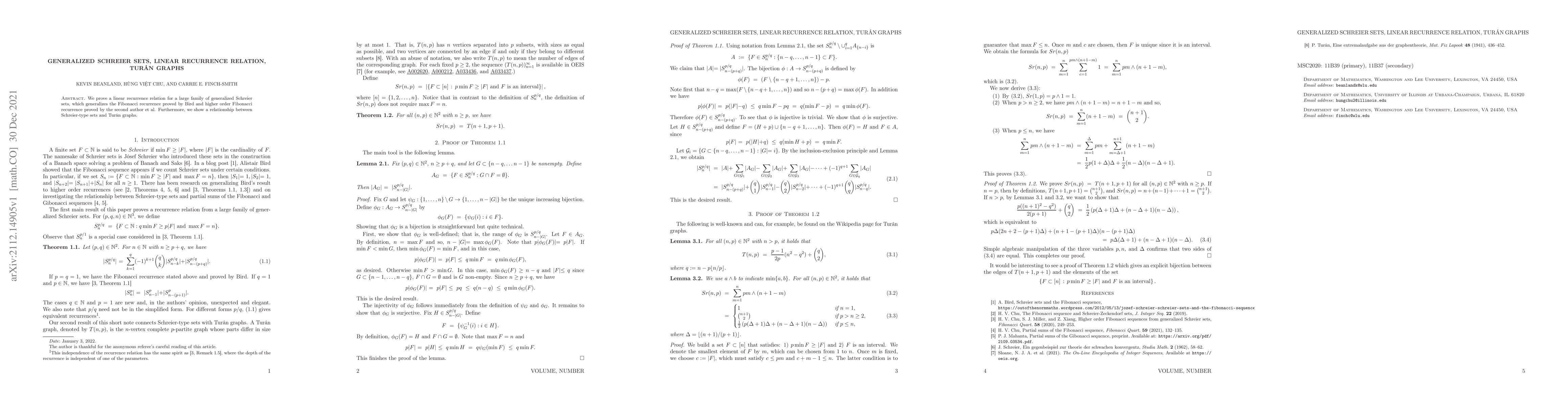 This paper establishes a linear recurrence relation for generalized Schreier sets, extending previous results on Fibonacci sequences, and demonstrates a connection between these sets and Turán graphs.