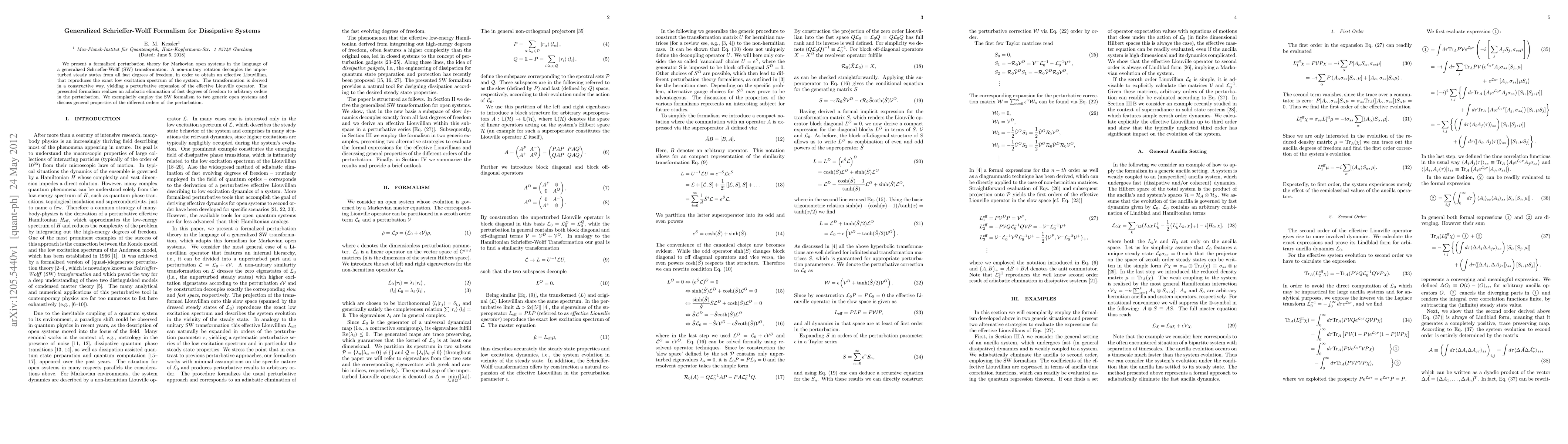 This paper develops a generalized Schrieffer-Wolff formalism for Markovian open systems, using a non-unitary transformation to eliminate fast degrees of freedom and obtain an effective Liouvillian. This formalism allows for an adiabatic elimination of fast dynamics to any perturbation order and is demonstrated on two generic systems.